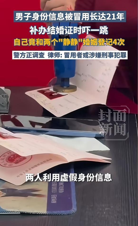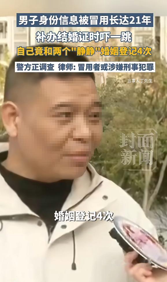 “解释不清了!”12月25日,河南郑州,一男子补办结婚证时,发现自己户籍上多了2个叫“静静”的媳妇,还结婚离婚4次,期间还曾买车买房,这让男子一下就懵了,连忙跟妻子解释,自己真不认识这两名“静静”。网友:以后有得哄了! 事情的起因特别简单丁先生和妻子相伴多年,原先的结婚证不小心遗失了,想着要证明夫妻关系的合法性,便没多想拉着妻子一起去了办事大厅补办,在他看来这就是走个流程、敲个章的小事,用不了多久就能办完。可当工作人员敲击键盘、调取户籍档案的那一刻,原本轻松的氛围瞬间凝固,空气安静得让人窒息。 系统屏幕上除了丁先生身边的结发妻子,还赫然挂着另外两名配偶的信息,巧得很,这两人名字里都带着“静静”,更离谱的是,档案记录显示,这些年里,“丁先生”竟然先后和这两个“静静”经历了四次结婚、离婚,妥妥的一段“丰富情史”。 还没等丁先生从“重婚”的震惊中缓过神,系统又跳出了新的信息,他名下竟有几处不知何时购置的房产和车辆,这一连串的意外,直接让他大脑宕机,站在原地不知所措。 身旁的妻子看着屏幕上白纸黑字的记录,脸色瞬间沉了下来,怒火几乎要冲破理智,好好的补办证件,硬生生变成了“抓包现场”,任谁遇到这种事都难以平静。 丁先生回过神后,第一反应就是拉着妻子解释,语气急切又慌乱,反复强调自己真的不认识这两个“静静”,这些事他一概不知,可越解释越显得苍白,那种百口莫辩的窘境,只有他自己最清楚。 他甚至开始自我怀疑,是不是系统出了故障,可工作人员反复核对后,确认信息无误。丁先生这才猛然想起,早在2010年他就发现自己的身份信息有被冒用的迹象,只是当时没太当回事,更没料到,那个隐匿在暗处的冒用者,竟然顶着他的名字活了整整15年。 随着调查深入荒诞的真相慢慢浮出水面。这一切并非系统数据乱码,而是一场长达15年的身份盗窃,更离谱的是,档案里的两个“静静”其实是同一个人,而那个顶着丁先生名字买车买房、反复结婚离婚的,正是这位“静静”的真丈夫,这对夫妻竟大摇大摆地顶着别人的身份,过了这么多年安稳日子,把丁先生蒙在鼓里。 事情败露后冒用丁先生身份的男人主动联系了他,还提出了“私了”的请求,想用钱抹平这段荒唐事,可丁先生想都没想就拒绝了,在他看来这根本不是钱能解决的问题,法律上的纠纷可以慢慢处理,可家里的矛盾却成了一团乱麻难以梳理。 尽管丁先生拼尽全力证明自己的清白,反复跟妻子解释自己是身份被冒用,可妻子心里的那根刺,哪是一时半会儿能拔掉的,理智上她或许知道丈夫是无辜的,但情感上看着丈夫名下跟同一个名字反复结离四次,心里难免膈应,这场突如其来的风波,给原本和睦的家庭划开了一道裂痕。 网友们得知此事后,纷纷调侃留言,语气扎心又真实:“丁先生这以后的日子不好过了,有得哄老婆了”“怕是以后吵架都直不起腰杆,‘静静’这两个字要成阴影了”,如今的丁先生,一边要处理冒用者留下的烂摊子,一边要小心翼翼安抚气头上的妻子,面对这莫名其妙的两个“媳妇”和房车,他是真的想静静了,可惜绝不是户口本上那两个“静静”。 (信息来源:《男子身份信息被冒用长达21年,补办结婚证时吓一跳,自己竟和两个“静静”婚姻登记4次》封面新闻)