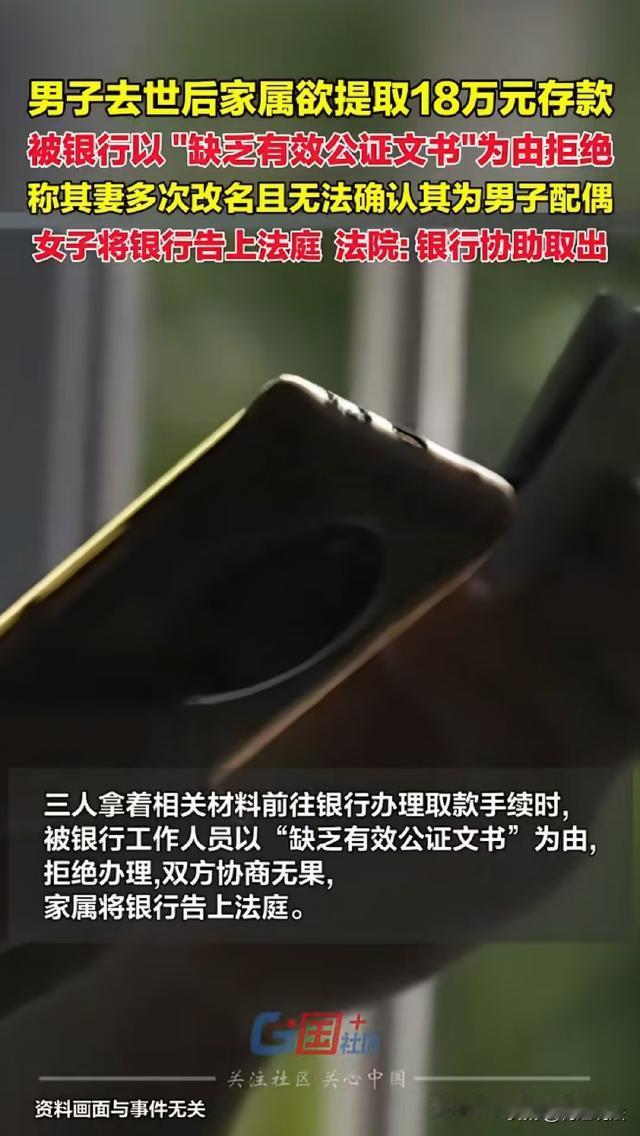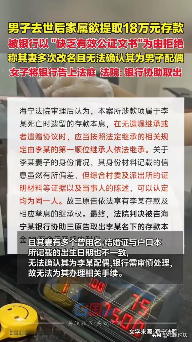 浙江海宁,男子李某突然离世,没来得及留下遗嘱。随后,李某的母亲和妻儿准备取出他名下的18万存款,却被告知李某的妻子多次改名,不能认定她为李某的配偶,并以此为由拒绝他们取款。李某的妻子一气之下将该行起诉了,法院这样判。 据国+社区报道,李某家里有一个妻子一个儿子,还有一个年迈的老母亲。 从2014年到2019年,李某一直陆陆续续往海宁某行存钱,先后持有6张存单,共计存入18万余元。 2019年6月,李某突发意外离世,临走前没有留下只言片语,更没有留下遗嘱。 办理完李某的后事,李某的妻子、儿子及母亲,准备取出李某名下的那18万多元。 于是,三人带着相关材料去该行办理取款。 可让他们没想到是,柜员称,取款需要带身份材料,证明他们是李某的家属。 李某的妻子愣住了,只好回去找所有能证明身份信息的材料,再次来到该行。 这次,三人带了他们的身份证以及户口本,李某妻子还把结婚证带上了。 可柜员称,李某的妻子的资料有问题,无法确认她是李某的配偶,不能给他们办理取款业务。 原来,李某的妻子曾经多次改名,结婚证上的出生日期和户口本上的日期也不一样。 听完柜员的话,三人只好再次回家。这次,李某的妻子去村里开了证明,又去所里找民警开了证明,证明她和李某确实是夫妻。 可等他们再次去取款时,柜员又称,因缺乏有效公证材料,不能为他们办理取款业务。 柜员说,存款人不在了,家属需要去当地的公证处,申请一个继承权证明,然后拿着证明来办取款,现在他们没有办理这个证明,就不符合取款规定。 存钱的时候一切都好说,怎么取钱的时候事情就这么多? 李某的妻儿和母亲跑了好几趟,钱却取不出来,几人非常生气,认为存款行就是在故意为难他们。 气愤之下,李某的家属起诉了存款行,要求他们支付18万余元的本金并支付利息。 那么,李某离世后,名下的存款到底应该怎样才能取出来? 一般来讲,存款人离世后他的存款就变成了遗产。 根据《关于查询、停止支付和没收个人在银行的存款以及存款人死亡后的存款过户或支付手续的联合通知》规定,存款人离世后,合法继承人为证明自己的身份和有权提取该项存款,应向当地公证处申请办理继承权证明书,银行凭以办理过户或支付手续。如该项存款的继承权发生争执时,应由人民法院判处,银行凭人民法院的判决书、裁定书或调解书办理过户或支付手续。 所以说,该行要求李某家属去办理公证,是正常且合法的要求。 至于李某妻子的身份问题,即便她多次改名,结婚证与户口本出生日期不一致,家属也可以通过提供户籍变更证明、身份关联证明等材料,来证实其与李某的配偶关系。 之后,家属应前往当地公证处申请办理继承权证明书。 公证处会对继承人的身份、继承权等事项进行审查核实,确认无误后出具继承权证明书,家属持该证明书前往银行,银行就应按规定办理取款业务。 李某妻子起诉后,经审理认为,李某妻子的身份信息虽然有所偏差,但根据证据,可证实确实为同一个人。 因此,一审判该行在判决生效10天内,向李某的妻子、儿子及母亲支付18万余元的本金及利息。 值得注意的是,李某留下的18万余元,并非全部都是李某的遗产。 《民法典》第一千零六十二条规定,夫妻在婚姻关系存续期间所得的财产,一般归夫妻共同所有。 李某存入的18万余元,是在其与妻子婚姻关系存续期间完成的,若无特殊约定,这18万余元应属于夫妻共同财产。 所以,在进行遗产分割前,需要先将属于李某妻子的一半份额划分出来,即18万余元的一半,约9万余元归李某妻子所有。 《民法典》第一千一百二十三条规定,继承开始后,按照法定继承办理;有遗嘱的,按照遗嘱继承或者遗赠办理;有遗赠扶养协议的,按照协议办理。 李某未留下遗嘱,所以对于剩余的约9万余元存款,应按照法定继承进行分配。 李某的妻子、儿子和母亲均为第一顺序继承人,同一顺序继承人继承遗产的份额,一般应当均等。 但是,对生活有特殊困难,又缺乏劳动能力的继承人,分配遗产时,应当予以照顾。 在没有证据表明存在需要照顾、多分或少分的特殊情形下,李某的妻子、儿子和母亲应均等分配这约9万余元遗产,每人大约分得3万余元。 也就是说,李某的妻子最终可获得约12万余元,李某的儿子和母亲分别可获得约3万余元。