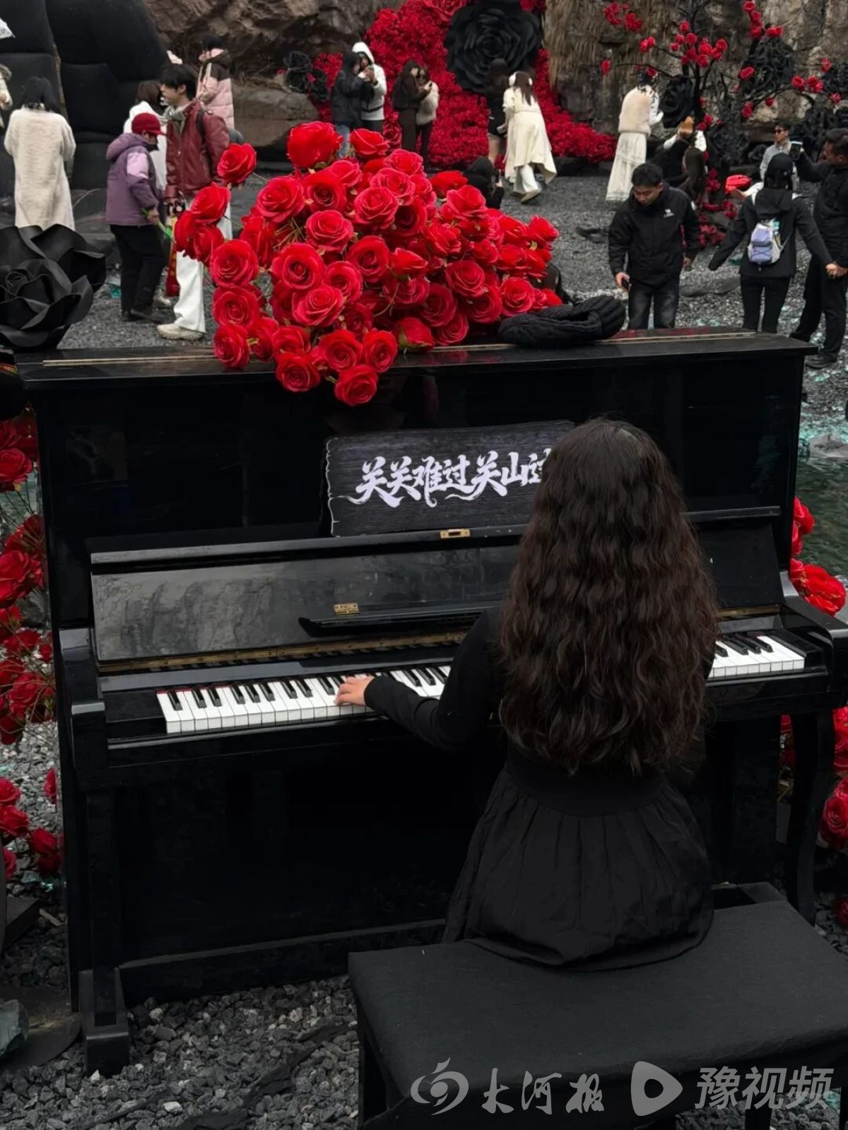 12月30日下午,河南新乡南太行关山景区幻梦谷内,一架名为“沉默之声”的黑色钢琴静静立在河畔,周身被红玫瑰环绕。一位游客走向前,坐下,即兴弹奏起来。