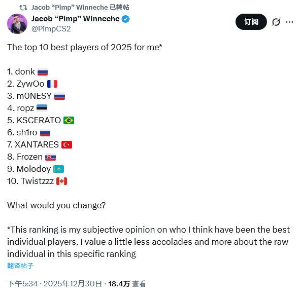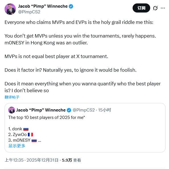 “那些把MVP和EVP当成评判“圣杯”的人,来解释下这个问题:你只有夺冠才会拿到MVP,这种情况很少例外——m0NESY在BLAST香港(拿MVP)算是个特例。MVP≠某赛事里的最佳选手。个人奖项重要吗?当然重要,忽视它是愚蠢的。但当你要评判“谁是最佳选手”时,个人奖项能代表一切吗?我觉得不能。”
