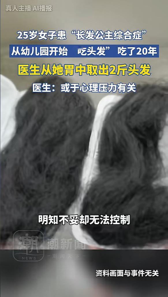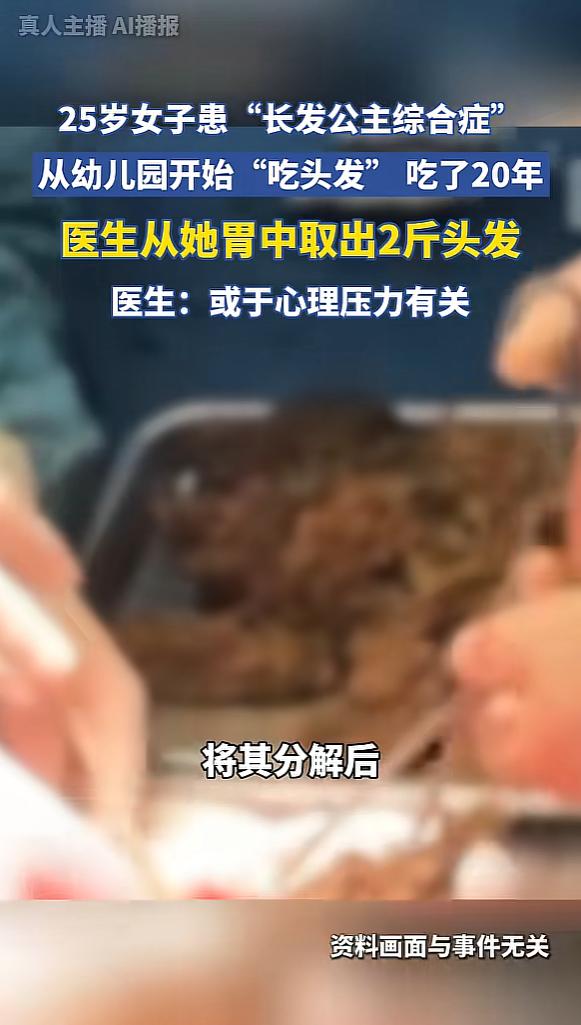 “悲剧还是发生了!”12月25日,浙江杭州,一女子从幼儿园开始就喜欢吃头发,这个习惯一直保持了20年,结果最近这段时间,她的肚子摸上去像石头一样硬,就医后,发现她的胃几乎被密密麻麻的头发塞满!头发里面还有一团巨大的异物! 前段时间女子就明显感觉到身体不对劲,消化功能越来越差,经常性消化不良,腹胀也成了常态,一开始她只当是小毛病,要么归咎于生活忙碌、饮食不规律,要么就是单纯轻视了这些不适,并没有第一时间就医检查,更没把这些症状和自己那个难以启齿的习惯联系起来,就这么硬扛着忽视了身体发出的求救信号。 直到后来情况越来越严重,女子的腹部变得越来越硬,用手一摸就像触碰到石头一样,紧绷又坚硬,更让人难受的是,胃里的空间几乎被完全占据,正常的食物根本无法顺利进入,进食变成了一件不可能完成的事,生理功能近乎停摆,实在无法忍受的她,才终于下定决心走进医院寻求帮助。 经过详细检查,医生给出的结果让女子和在场医护人员都格外错愕,检查显示她的胃里没有普通的病灶,取而代之的是一团缠绕得密不透风的黑色团块,团块内部除了成千上万根头发,还夹杂着食物残渣、粘液等异物,这些东西互相胶着、凝结,质地坚硬,几乎填满了整个胃腔。 而这团可怕的异物,源头要追溯到女子的童年。早在她上幼儿园的年纪,就养成了吞食头发的习惯,一开始或许只是孩童无意识的探索行为,可随着成长这个举动并没有消失,反而慢慢演变成了一种无法控制的应激反应,每当她心情低落、被压力裹挟时,吞食头发就成了唯一的慰藉方式,用来平复内心的不安。 这个怪异的癖好,像附骨之蛆一样伴随了她整整20年,即便后来长大成人,理智上清楚吃头发既怪异又有害健康,可在情绪灰暗的时刻,身体的本能还是会凌驾于意志之上,她根本控制不住自己,一次次吞咽头发,也一次次给自己的身体埋下隐患。 没人知道这20年里,她吞下了多少根头发,人类的胃酸虽然强劲,却根本无法分解头发中的角蛋白,这些被吞入的头发无法被消化,也没能随代谢排出体外,只能在胃里滞留、堆积,它们像一张贪婪的网,不断缠绕、吸附后续进入胃里的食物残渣和粘液,日积月累,慢慢团聚变大,最终钙化般变得坚不可摧,形成了这团致命的“胃石”。 由于这团头发异物体积过大、硬度太高,内镜碎石、药物溶解等保守治疗手段根本无法奏效。为了保住女子的健康和生命,医生只能选择开腹手术,用手术刀将这个盘踞在胃里多年的“巨石”完整取出,当这个重达两斤、形状狰狞的黑色团块被放在手术盘上时,强烈的视觉冲击让在场医生都忍不住倒吸一口凉气。 这件事被曝光后,不少网友都表示“头皮发麻”,既为女子的遭遇感到惋惜,也被这个坚持了20年的危险习惯所震撼,这从来都不是一个猎奇的案例,而是一堂沉重的健康警示课,每个人都有排解压力的方式,可当一种习惯开始对身体造成不可逆的伤害时,就不再是无伤大雅的小事,而是必须正视和干预的病症。 手术虽然取出了胃里的“石头”,但女子要面对的挑战还远未结束,如何彻底戒除这个延续了20年的习惯,如何找到健康的情绪宣泄方式,抚平内心的阴霾,才是她术后漫长岁月里最需要解决的课题,这起悲剧也提醒着所有人,忽视身体的信号、纵容有害的习惯,最终只会让自己付出沉重的代价。 (信息来源:《25岁女子患上“长发公主综合症”,胃里取出2斤头发》潮新闻)