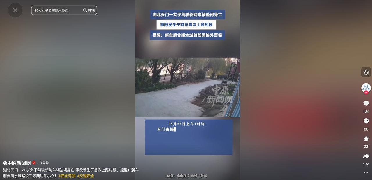 驾车不慎坠河的26岁女车主真的很漂亮!她的新能源车是湖北孝感牌照,其一个人在天门工作。就在前几天,她才告知家人自己买了新车,结果都还没来的及开回家,悲剧就发生了! 监控镜头沉默地记录下了全过程,那辆悬挂着湖北孝感牌照的崭新新能源车,本应行驶在正常轨迹上,却在清冷的晨光里,义无反顾地偏离了路线。 这台车承载着女孩的小小心愿,是她独自在异乡打拼两年,用汗水攒下的成果,崭新的车身还透着未褪去的新车质感,可惜它的主人,那个1999年出生的陕西姑娘,再也没机会带着它踏上归途。 女孩一个人在天门工作,平日里独立又坚韧,朋友圈里的她总是爱笑,眉眼间藏着不服输的韧劲,就在事故发生前几天,她还在电话里雀跃地告诉远方的父母,自己买了新车,特意选了孝感牌照,想着以后往返陕西老家会更方便。 她满心欢喜地许诺父母:“过两天就回来,一定让你们亲手摸摸新车的方向盘。” 这份简单又温暖的孝心,终究成了无法兑现的遗憾。 谁也没想到这场关于回家的期盼,会终结在冰冷的河水中,回看事故发生的瞬间,每一个细节都透着令人揪心的惋惜。 车身碾过路边绿化带、切入人行步道时,车尾的大灯还亮着,这个细节暗示着,这位刚拿到驾照不久的新手司机,在那几秒里彻底慌了神,或许本想踩下刹车,脚却误踩在了油门上。 作为新手面对突发状况的慌乱本可理解,但新能源车的特性,让这次误操作的后果被成倍放大,与传统燃油车不同,电机的瞬时扭矩极强,再加上单踏板模式带来的肌肉记忆混淆,女孩或许潜意识里以为松开踏板就能减速,却没料到错踩油门后,巨大的推力瞬间剥夺了她修正方向的机会。 其实只要方向盘轻轻转动十度,哪怕是微小的调整,都有可能避开那致命的河堤,可命运没有给她重来的机会,车辆滑入水中的瞬间,生存的黄金30秒开始倒计时,可冰冷的河水很快成了绝望的囚笼。 打捞后现场留下的痕迹令人不忍卒睹:女孩的身体保持着向后扭转的姿态,或许是在慌乱中寻找逃生的路,又或许是想解开平日里守护安全、此刻却成了束缚的安全带,她穿着干干净净的白鞋黑裤,本是体面地去上班,却再也没能走出这场梦魇。 很多人在绝境中都会犯同一个错误,女孩或许也不例外,车落水后巨大的水压会死死顶住车门,此时推门无异于以卵击石,可九成受困者的第一反应都是推门。 更遗憾的是这辆还没来得及添置杂物的新车里,大概率没有配备破窗器,而新能源车隐蔽的手动解锁装置,对没经过特训的新手来说,就像藏在迷宫里的开关根本无从寻找。 这场悲剧远不止是个体操作的失误,从路面到河道不过三百米距离,中间有绿化带、有人行道,却唯独缺少一道能兜底的坚固护栏,城市基建的缺口,在关键时刻成了吞噬生命的黑洞,而快速拿证的驾培行业或许也该反思,教会了学员如何开车,却没人认真教过她们,如何在绝境中求生。 所有的假设都换不回时光倒流,那个爱笑的漂亮女孩,那份想让父母摸一摸方向盘的孝心,连同她独自打拼的倔强,都永远沉入了冰冷的水底,她的离去在寒冬里给所有上路的人敲了一记沉重的警钟,安全从不是一句口号,而是个人技能、车辆设计、城市防护共同编织的网。 只可惜这一次这张网破了,留下了无尽的惋惜与遗憾,也让远方的父母,永远等不到女儿开着新车回家的那一天。