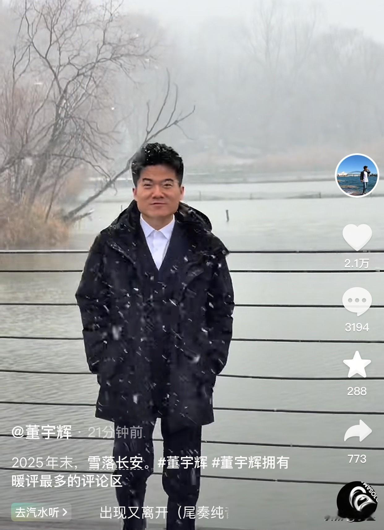 董宇辉回老家后可真勤快 一天一条短视频的发 今天恰逢西安初雪 瑞雪兆丰年的好意头 也是让彪哥赶上了 看这状态多好,神采奕奕的 不如把直播间搬去西安吧 反正是直播在哪都一样 在西安还能让彪哥睡眠好 雪落长安,今宵乐起 晚上的跨年晚会 静候211同学大集合 大家跟董宇辉一起跨年[耶]