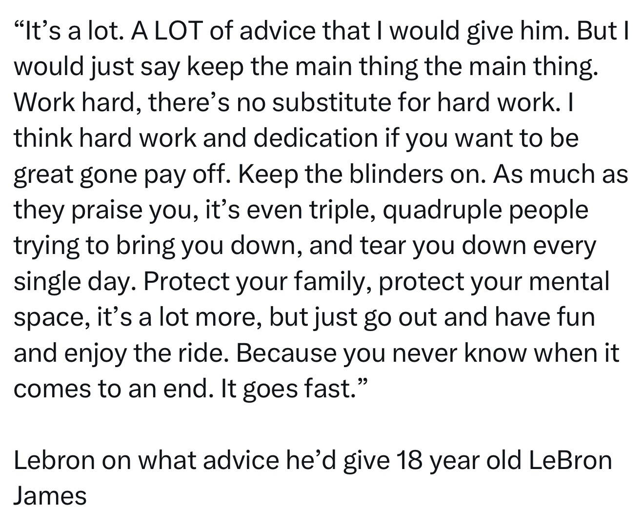 詹姆斯谈他会给18岁的自己什么建议:“我会给他很多很多建议。但我会说,永远要抓住重点。努力奋斗,这是无可替代的。我认为,如果你想要变得伟大,努力和奉献终会得到回报。专注于你的目标。无论人们如何赞美你,试图贬低你、击垮你的人都只会多上三倍、四倍,每一天都是如此。保护你的家人,保护你的精神世界,要说的还有很多,但总之,走出去享受过程吧。因为你永远不知道它何时会结束。这一切都过得很快。”