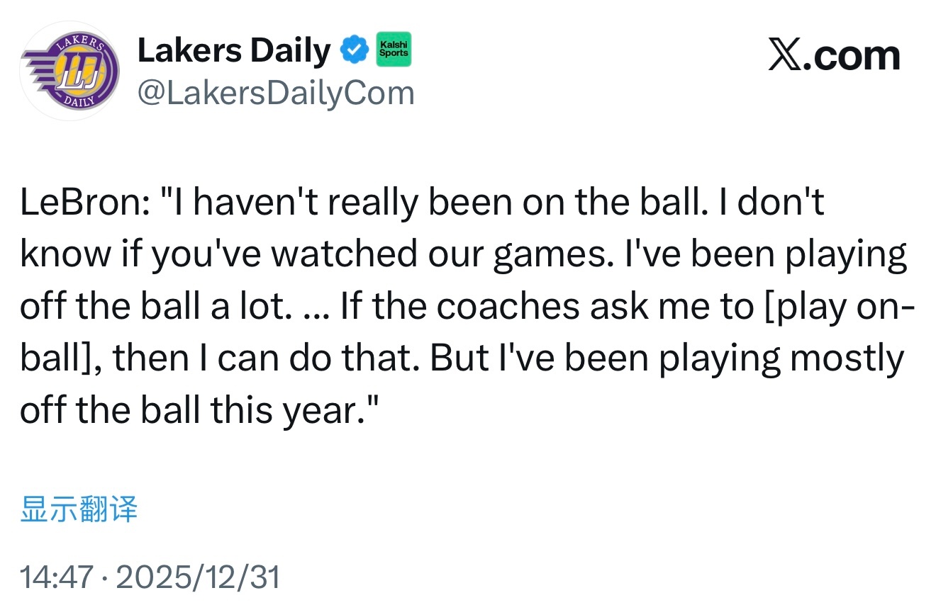 詹姆斯表示:“我其实很少持球。不知道你们是否看了比赛,我今年大多时候都在打无球…