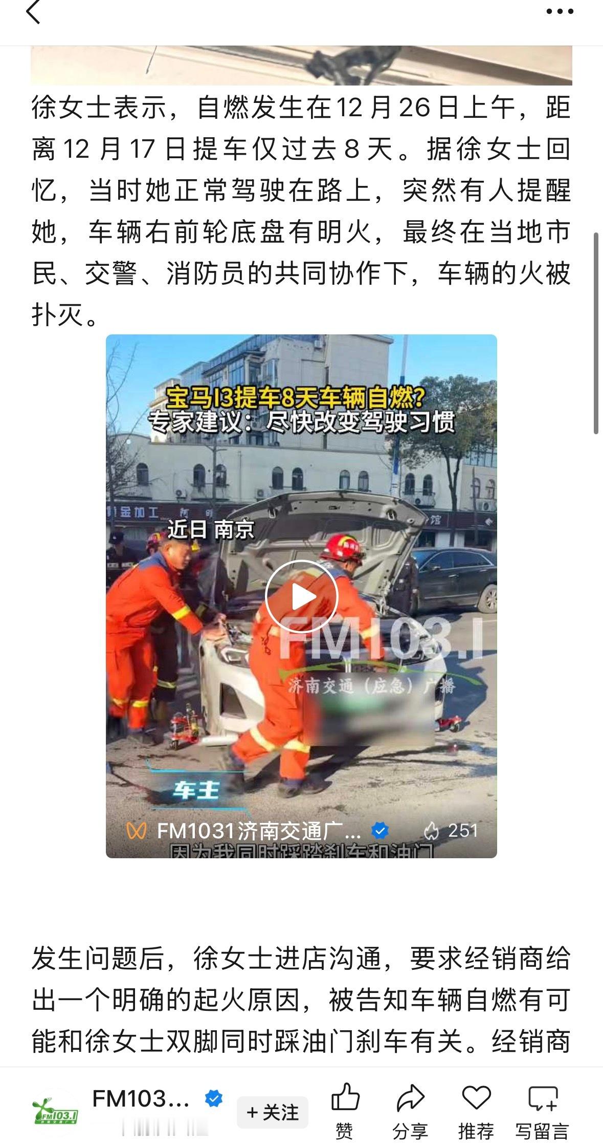 宝马i3自燃 【双脚同时踩油门和刹车引发自燃?】根据济南交通广播的消息,车主徐女士向《交广热线 汽车维权》栏目组反映,自己在南京德宝宝马4S店购买的车辆在行驶途中发生自燃。徐女士表示,自燃发生在12月26日上午,距离12月17日提车仅过去8天。据徐女士回忆,当时她正常驾驶在路上,突然有人提醒她,车辆右前轮底盘有明火,最终在当地市民、交警、消防员的共同协作下,车辆的火被扑灭。发生问题后,徐女士进店沟通,要求经销商给出一个明确的起火原因,被告知车辆自燃有可能和徐女士双脚同时踩油门刹车有关。经销商认为,徐女士的驾驶习惯导致刹车盘温度过高,引发线束起火。不过徐女士对经销商的说法并不认可,认为自己平时也是这样开车,但是没有发生任何问题。徐女士认为,车辆仅行驶了500公里,不应该出现自燃的情况。此外,她还强调车辆自燃的时候,她并没有深踩油门和刹车,不应该触发本次自燃。