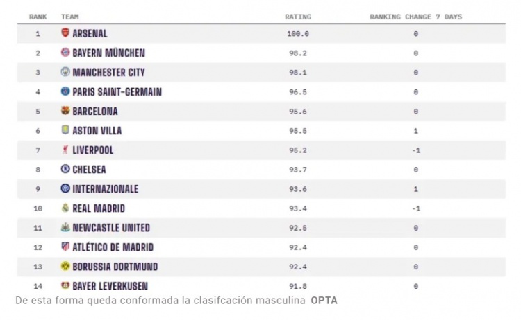 相比之下,男足的排名则有所不同。阿森纳以满分100分位居榜首,拜仁慕尼黑(98.2分)和曼彻斯特城(98.1分)分列第二和第三位。巴黎圣日耳曼(96.5分)和巴塞罗那(95.6分)也名列前茅。皇家马德里男足目前排名第10,评分为93.4分,在最近一次更新中下降了两个位置。切尔西(第8位,93.7分)和国际米兰(第9位,93.6分)都超过了他们。