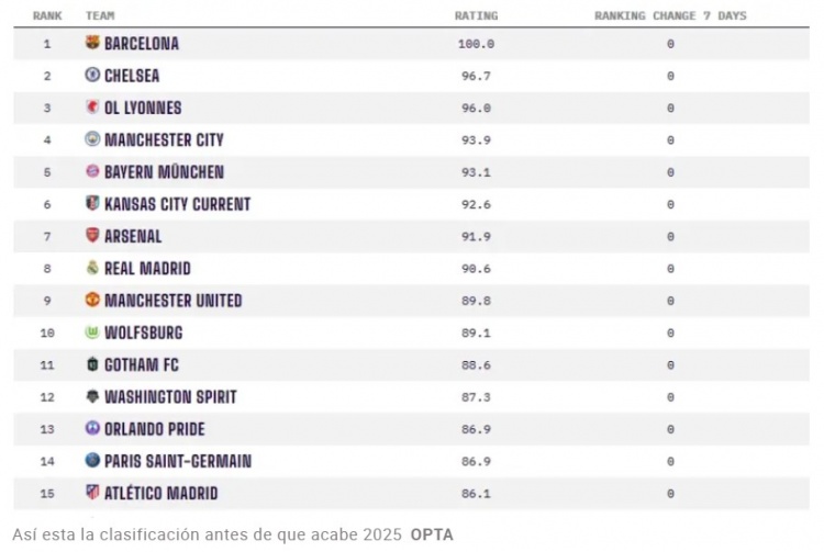 根据OptaPowerRankings的最新数据,皇家马德里女子足球队已经跻身世界前八名,而男子队则下滑至第十位。这一排名反映了俱乐部在近期比赛中的表现和对手的实力。
