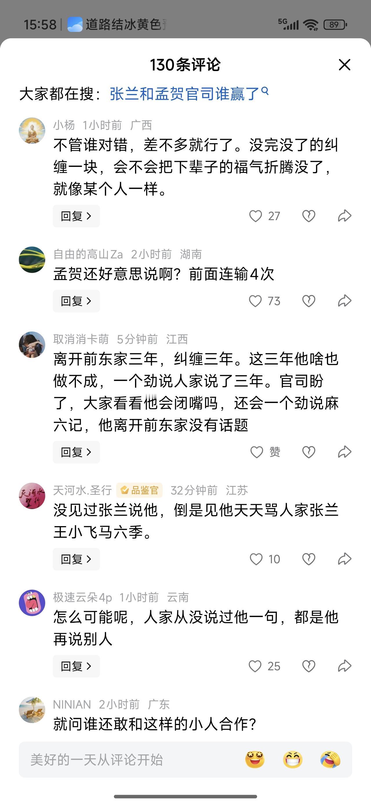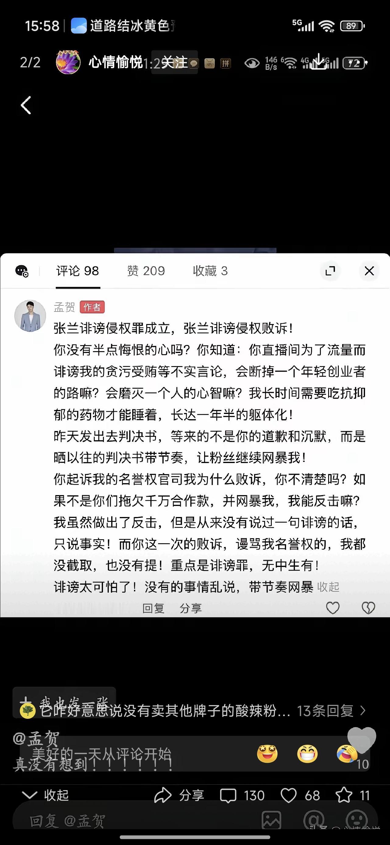 孟贺的官司赢了,好像关注的人并不多。小小子没事儿就骂张兰,期间谁对谁错真的那么重要吗?没有麻六记,你能挣那么多钱吗? 这三年,如果不打官司。夸张兰几句,背靠大树好乘凉,你能挣多少钱? 人有精气神儿的时间就那么二三十年。没必要这么纠缠的。 加油挣钱吧!多挣钱,舆论也会倾向于你。