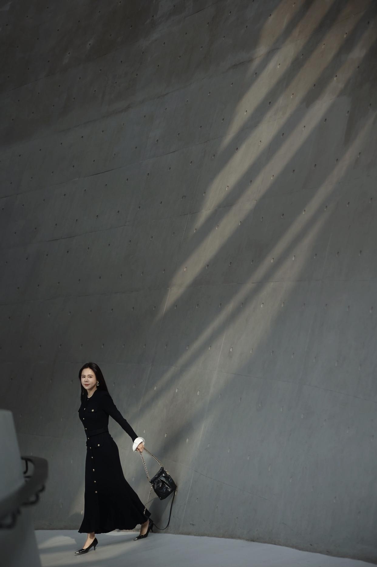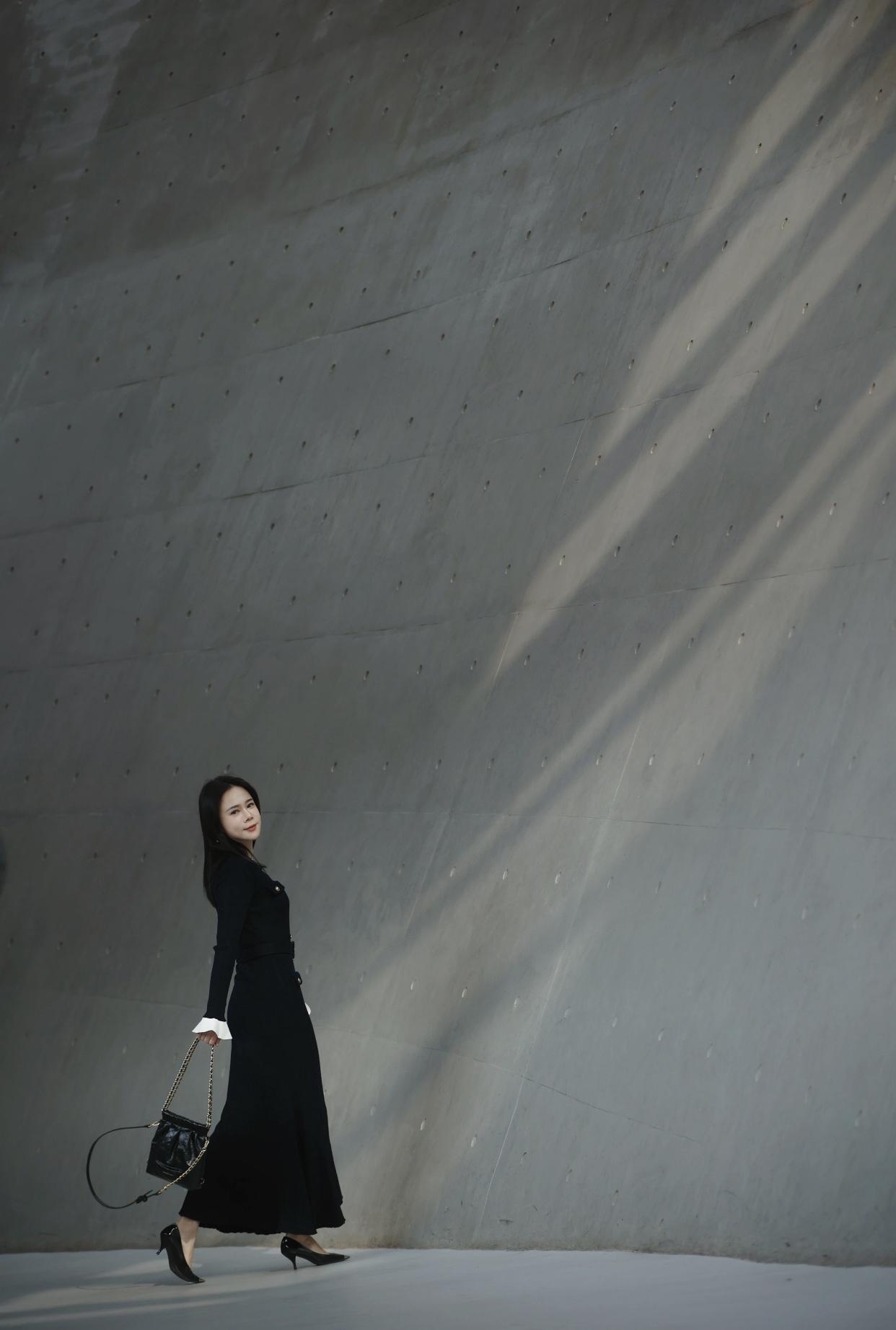 这套穿搭是优雅高级的灰黑撞色轻熟风,把温柔质感和精致细节融合得很得体。浅灰针织裙