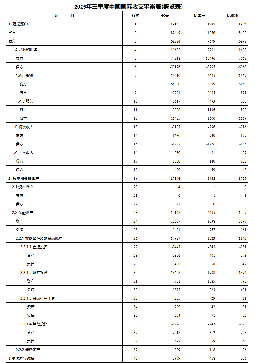 按SDR计值,2025年三季度,我国经常账户顺差1452亿SDR,资本和金融账户逆差1757亿SDR。