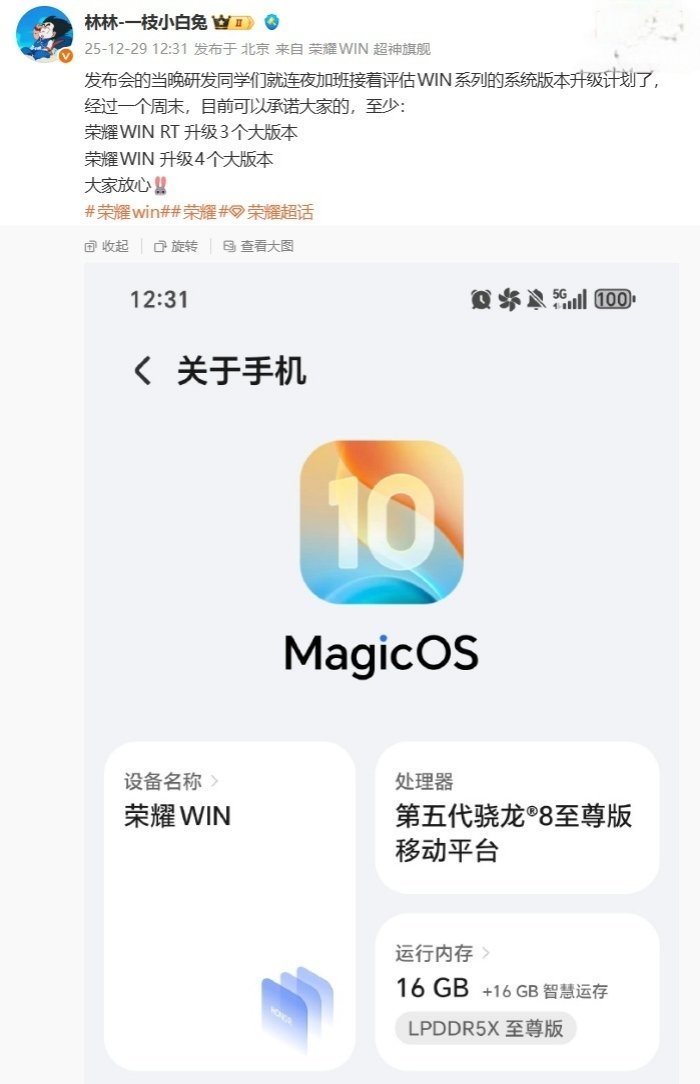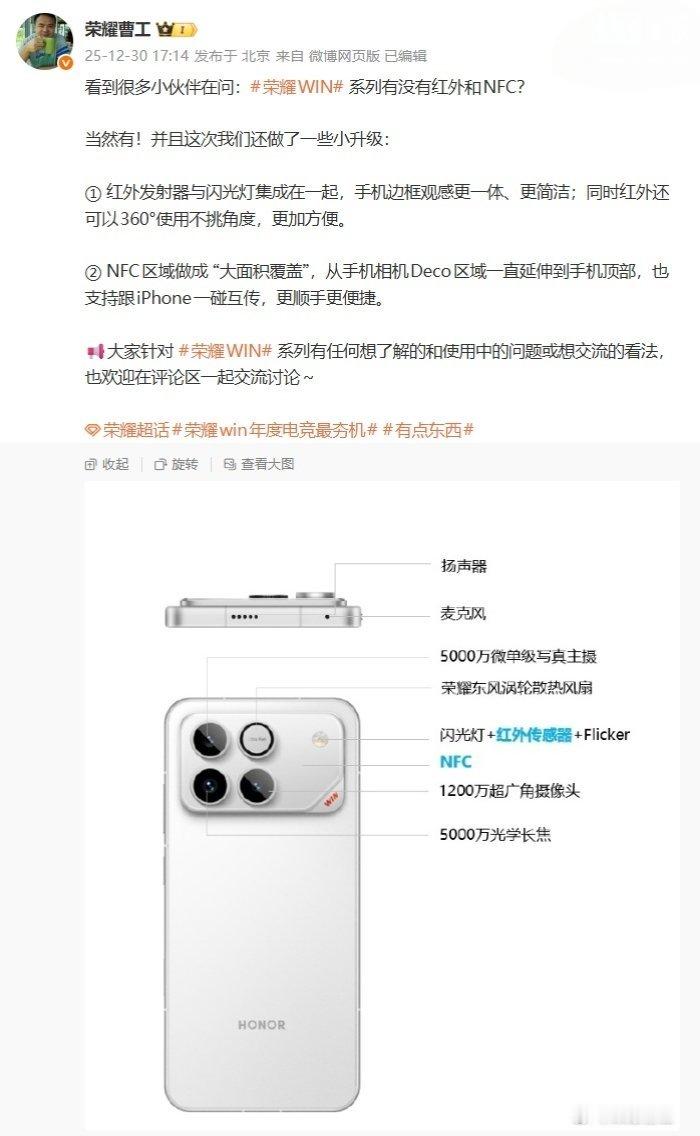 【荣耀 WIN 系列手机“小升级”公布:红外可 360° 使用、NFC 大面积覆盖实现跟 iPhone 一碰传】荣耀研发工程师 曹工发文介绍了荣耀 WIN 系列手机红外和 NFC 的升级点:红外发射器与闪光灯集成在一起,手机边框观感更一体、更简洁;同时红外还可以 360° 使用不挑角度,更加方便。NFC 区域做成“大面积覆盖”,从手机相机 Deco 区域一直延伸到手机顶部,也支持跟 iPhone 一碰互传,更顺手更便捷。荣耀中国区智慧生活业务部部长林林昨日分享了 WIN 系列手机评估后的系统版本升级计划,目前可以承诺的“至少”:荣耀 WIN RT 升级 3 个大版本荣耀 WIN 升级 4 个大版本