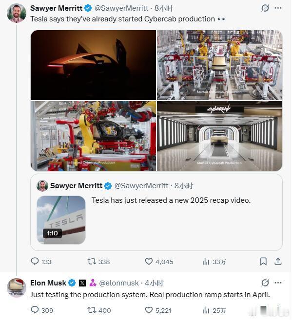 马斯克在X上承认已经开始对Cybercab无人驾驶出租车的生产系统测试,正式的量