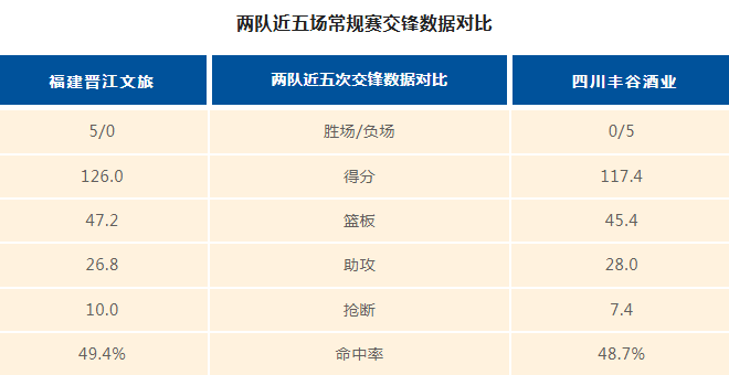 福建晋江文旅男篮与四川丰谷酒业男篮历史上一共交手27次,福建晋江文旅男篮14胜13负。上赛季两队交手2次,福建晋江文旅男篮2胜0负。