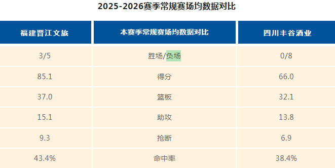 2025-2026赛季CBA常规赛第九轮福建晋江文旅客场挑战四川丰谷酒业。四川丰谷酒业男篮截止前八轮场均得分仅66分、失分高达92.8分。数据对比上,主队福建晋江文旅男篮在核心团队指标中暂时领先,场均得分85.1分、篮板37.0个、助攻15.1次、抢断9.8次均优于四川丰谷酒业男篮的对应数据,防守端场均失分89.1分也比四川更为稳健,仅三分命中率(30.2%)与四川(26.1%)同处低位,外线火力均不算突出。