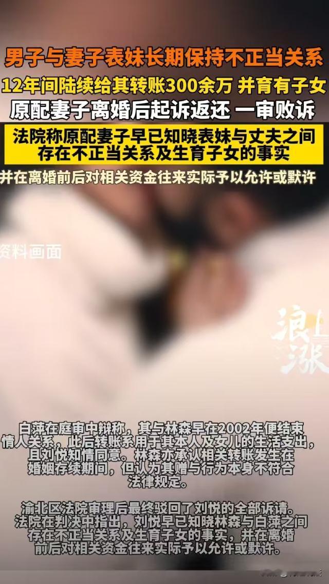 四川,刘女士和林某离婚后,女儿查账发现,林某和刘女士的表妹白某长期保持不正当关系,还生了一个女儿,林某还给白某转账380多万,不仅负担她的生活费,还资助她买房。刘女士气愤之下起诉白某,要求她返还全部款项。然而,表妹却说,这事刘女士早就知道了,自己和林某在一起,还是刘女士撮合的。 据红星新闻、浪涨新闻报道,林某和刘女士结婚多年,二人育有两个女儿。 刘女士和林某在海南打拼,挣下了丰厚的家产。 后来,刘女士亲姨妈家的表妹白某投奔过来,在林某的公司任职。 可刘女士没想到,接纳表妹,竟然是引狼入室。 原来,白某来后,不知什么时候开始,竟然和林某混在了一起。 刘女士深受打击,多次和林某吵架并提出离婚,但是,为了给女儿一个完整的家,刘女士最后并没有离。 刘女士深知,林某赚钱能力出众,自己就算离婚,也不一定能找到比他更好的,自己如果走了,正好给了白某上位的机会。 于是,刘女士要求林某辞退白某,并和她断绝关系。 谁知,关系没断了,白某却说她怀孕了。十月怀胎,白某生下了一个女儿心心。 心心出生后,刘女士心灰意冷,再次向林某提出了离婚。 但是,林某并不愿意离婚,为了挽回妻子的心,2002年,林某叫来了丈母娘和白某的母亲,在她们的见证下,和白某断绝了关系。 刘女士为了两个年幼的女儿,再次原谅了林某。 转眼就是20年过去,刘女士和林某的感情还是走到了尽头。2022年,刘女士和林某离婚了。 2023年,刘女士和林某的女儿查账时发现,林某在2010年到2022年的12月期间,竟然一直在给白某转账,先后转了380多万。 2024年11月,刘女士掌握了足够的证据后,将白某和林某起诉了。 刘女士称,根据《民法典》第一千零六十二条规定,夫妻在婚姻关系存续期间所得的财产,属于夫妻共同财产,夫妻对共同财产有平等的处理权。 林某在与自己婚姻关系存续期间,给白某转账 380 多万,该款项属于林某和自己的夫妻共同财产。 林某未经自己同意,擅自将大额夫妻共同财产赠与白某,侵犯了自己对夫妻共同财产的平等处理权。 根据《民法典》第八条规定,民事主体从事民事活动,不得违反法律,不得违背公序良俗。 林某与白某存在不正当关系,还将夫妻共同财产赠与白某,违背了公序良俗。这种基于不正当关系的财产赠与,不应当受到法律的保护。 因此,刘女士要求确认林某的赠予行为无效,并要求白某返还夫妻共同财产380万余元。 但是,白某却说,自己和林某在一起,就是刘女士撮合的。 白某还说,自己和林某断绝关系后,林某给自己钱,刘女士从始至终都知道这回事。 而且,林某给自己钱,不是为了维系和自己的关系,而是给她和女儿的生活开销。 所以,林某给自己钱,并不违背公序良俗,合法有效。 对此,刘女士并不认可,如果白某和林某是自己撮合的,自己用得着再三闹离婚吗? 林某自己也承认,他给女儿的生活费,是另外支付的,给白某的这些钱,确实属于他和刘女士的夫妻共同财产。 可让人没想到的是,一审认为,白某提供的聊天记录中,白某确实是刘女士介绍给林某认识的,刘女士还告诉白某,说林某很喜欢她。 后来,白某生下女儿心心,心心的户籍监护人也写的是刘女士的名字。 并且,两人聊天记录显示,刘女士在知道林某定期向白某支付生活费、承诺在一定条件下给她养老费的情况下,还劝白某要像一家人一样。 一审认为,刘女士明知林某给白某钱却未提出异议,应当认定为默许,驳回了刘女士的诉讼请求。 一审判决后,刘女士不服提起上诉,要求撤销一审判决,改判原审诉求。 那么,从法律上来讲,刘女士的诉求到底有无依据? 刘女士为了维护婚姻和家庭,对林某有情人一事有所容忍,但容忍丈夫出轨,并不等同于允许丈夫对夫妻共同财产进行赠与。 根据法律规定,对于夫妻共同财产的重大处分,应当取得双方一致同意。 林某给白某转账 380 多万,属于重大财产处分行为,不能仅凭刘女士未明确提出异议就认定为默许。 刘女士得知林某和白某的事后,曾多次和林某吵架并提出离婚,表明她对林某与白某的关系是不满和反对的。 而且,林某自己也承认给白某的这些钱属于夫妻共同财产,并非专门给女儿的生活费。 因此,刘女士的诉请是有充分法律依据的。 一审仅依据聊天记录等证据,就认定刘女士默许林某的赠与行为,证据并不确实、充分。 林某在二审答辩中表示,当初是刘女士提出离婚,他才和白某断绝联系的,刘女士对这段关系一直持不赞成态度。 现在,他深刻认识到了自己的错误,恳请二审确认自己的赠予行为有违公序良俗,确认自己的赠予无效。 目前,本案即将迎来二审开庭。