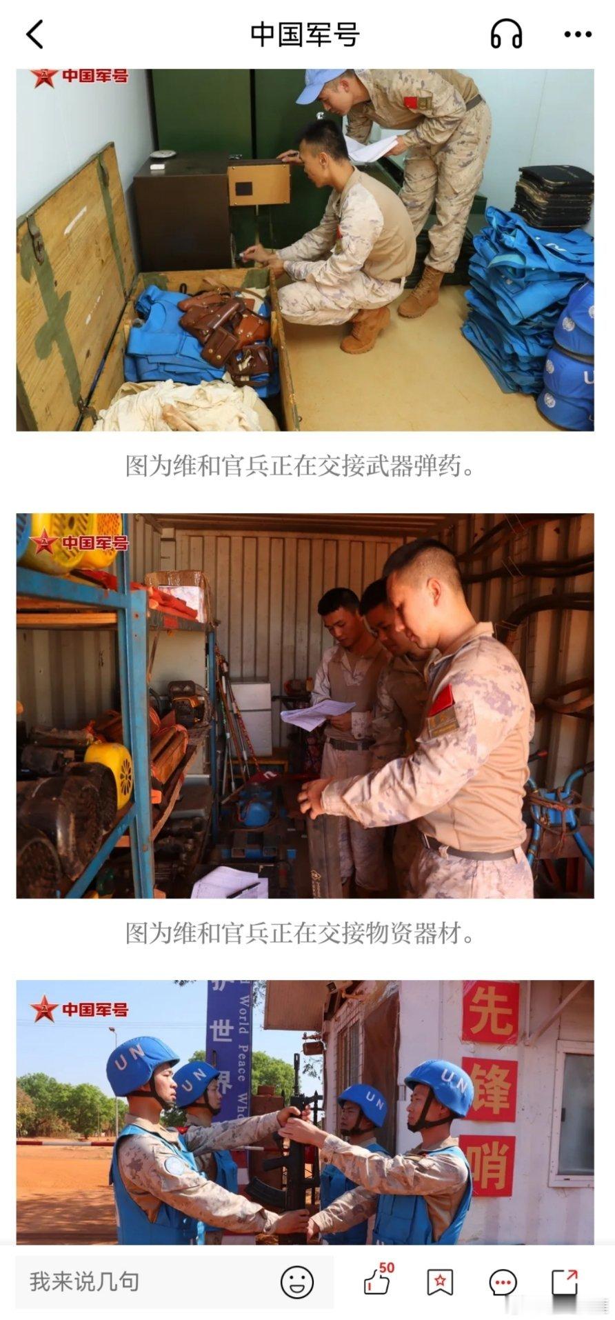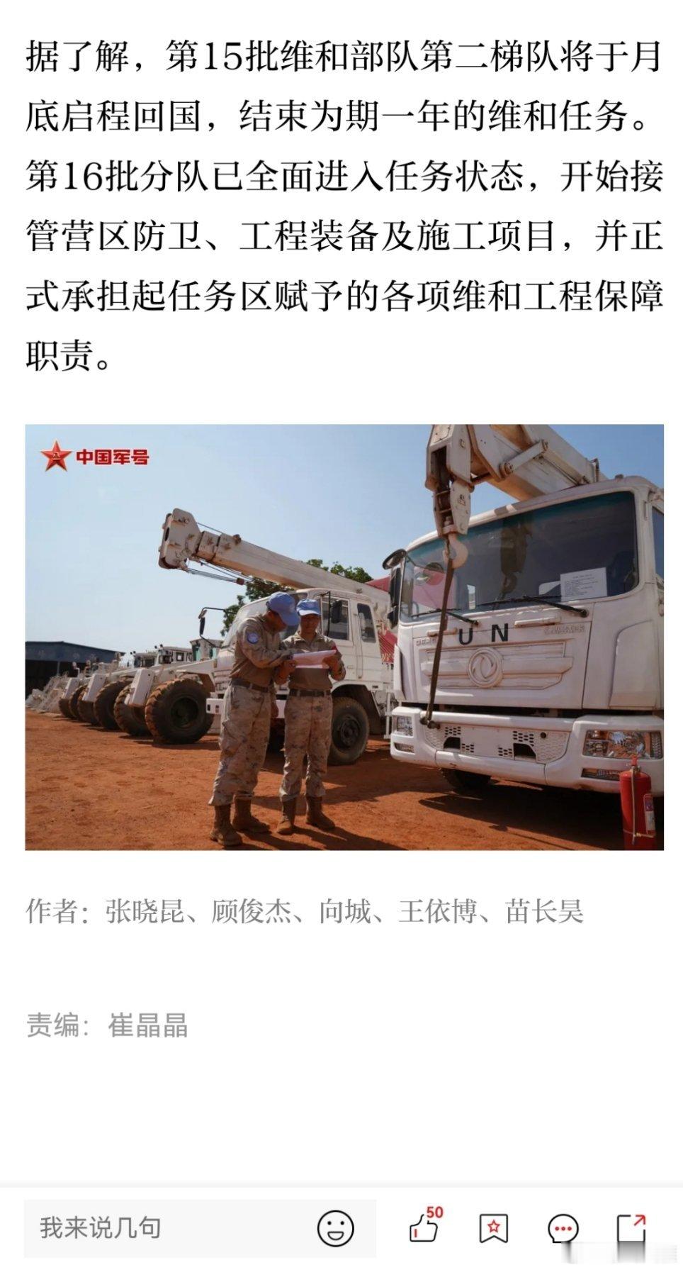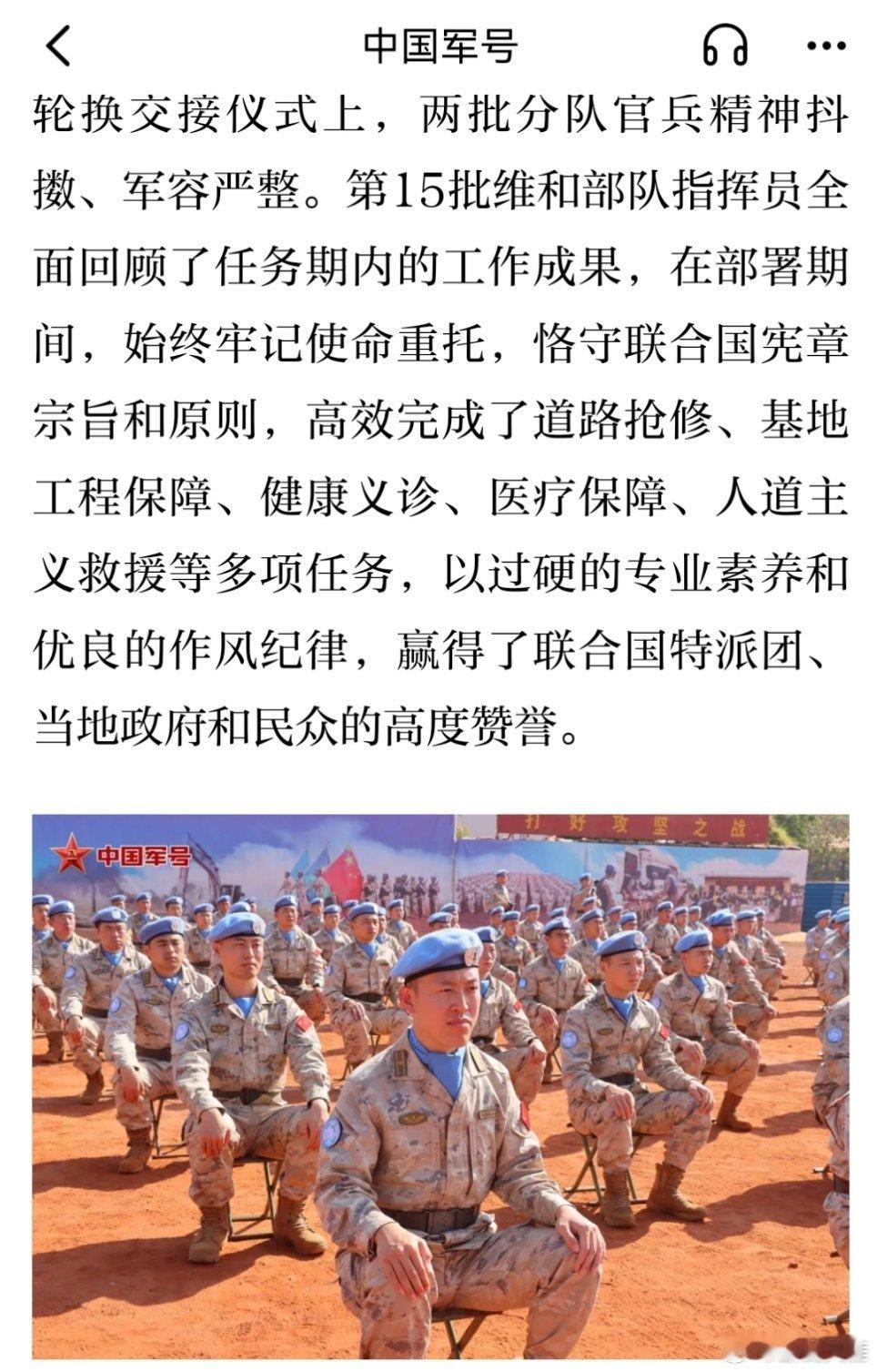 精忠蓝盔致敬中国军人致敬中国蓝盔 中国赴南苏丹(瓦乌)维和部队圆满完成轮换交接当地时间12月22日,中国第15批与第16批南苏丹(瓦乌)维和部队隆重举行轮换交接仪式,标志着为期一年的维和任务指挥权,装备物资及后续职责正式,平稳,有序地由新一批分队接替。(中国军号)