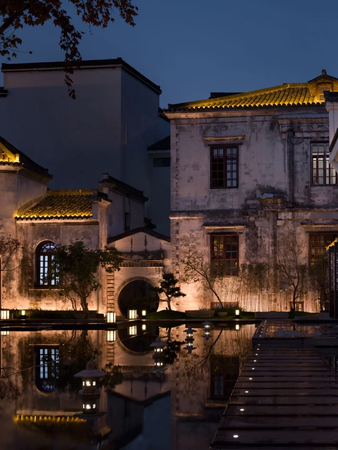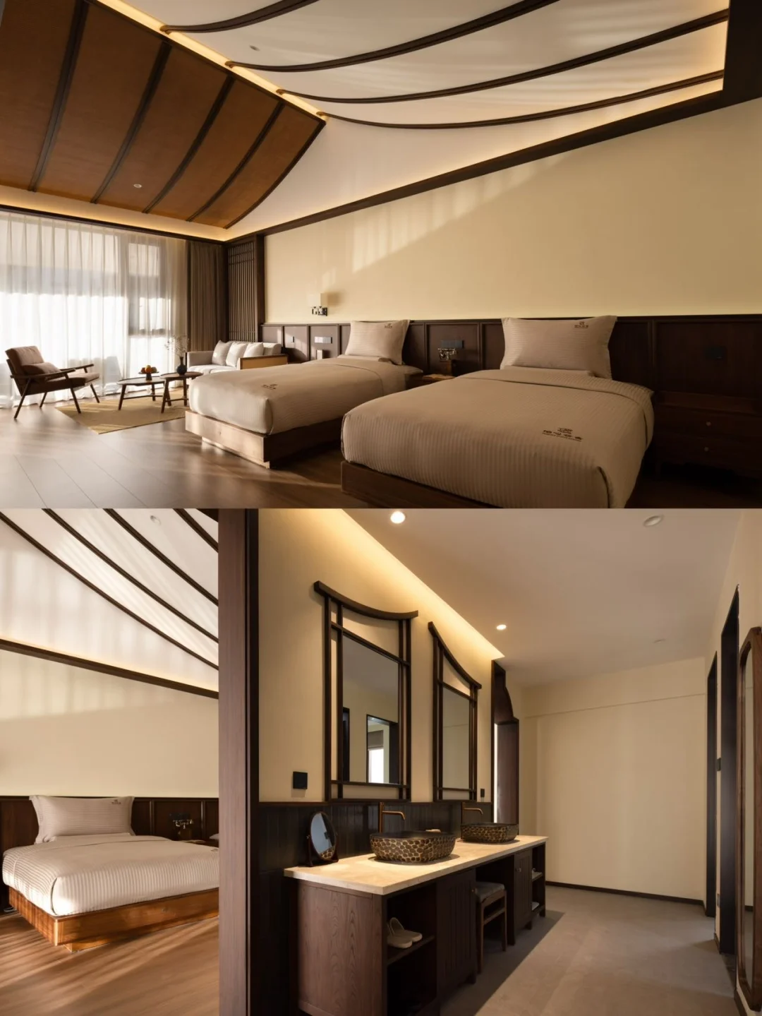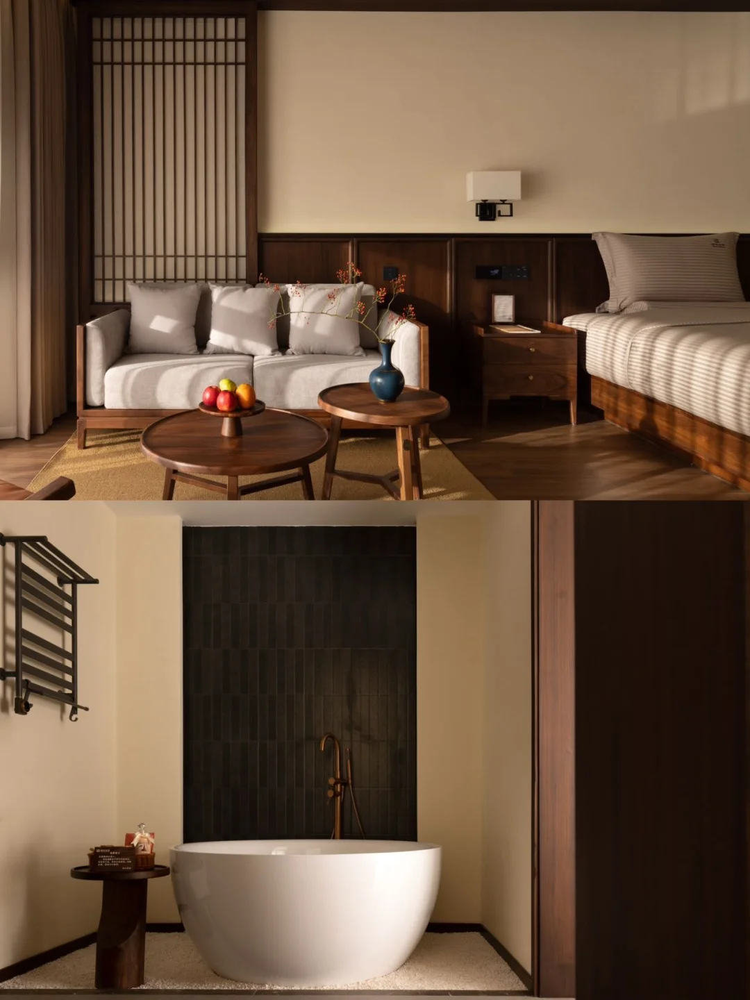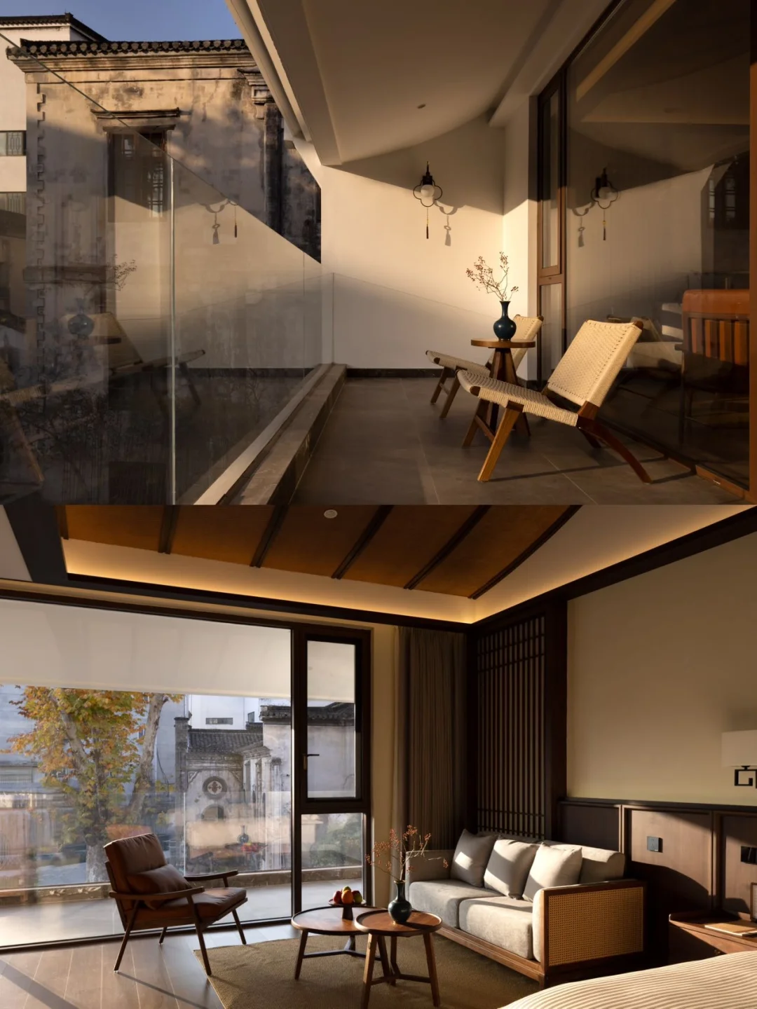 房间保留了徽州的骨架,却住进了舒适与温度。木质结构、素雅陈设,夜晚点一盏灯,整座山都安静了下来。