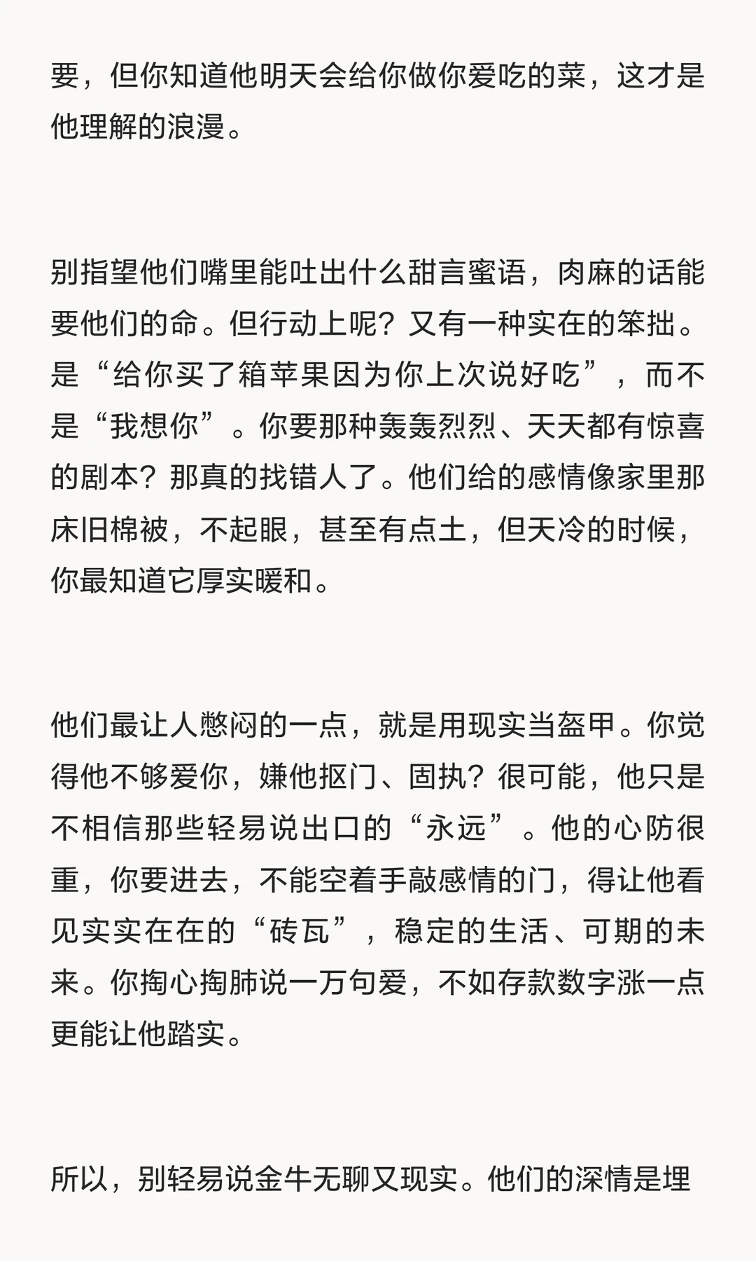 金牛座的心里有个账本,注重长期持有价值而不是浪漫。他们的深情埋在行动与稳定生活中,需要耐心挖掘。金牛座的爱是熬出来的,但很多人熬不到头。