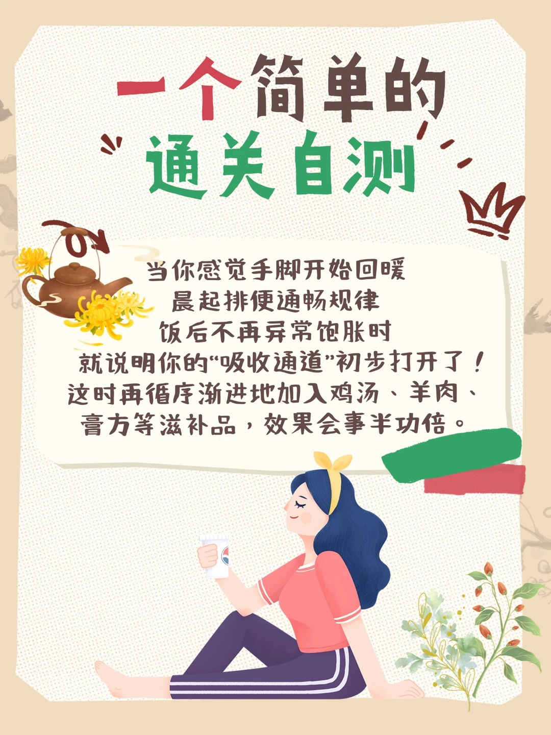 当你感觉手脚开始回暖、晨起排便通畅规律、饭后不再异常饱胀时,就说明你的“吸收通道”初步打开了!这时再循序渐进地加入鸡汤、羊肉、膏方等滋补品,效果会事半功倍。