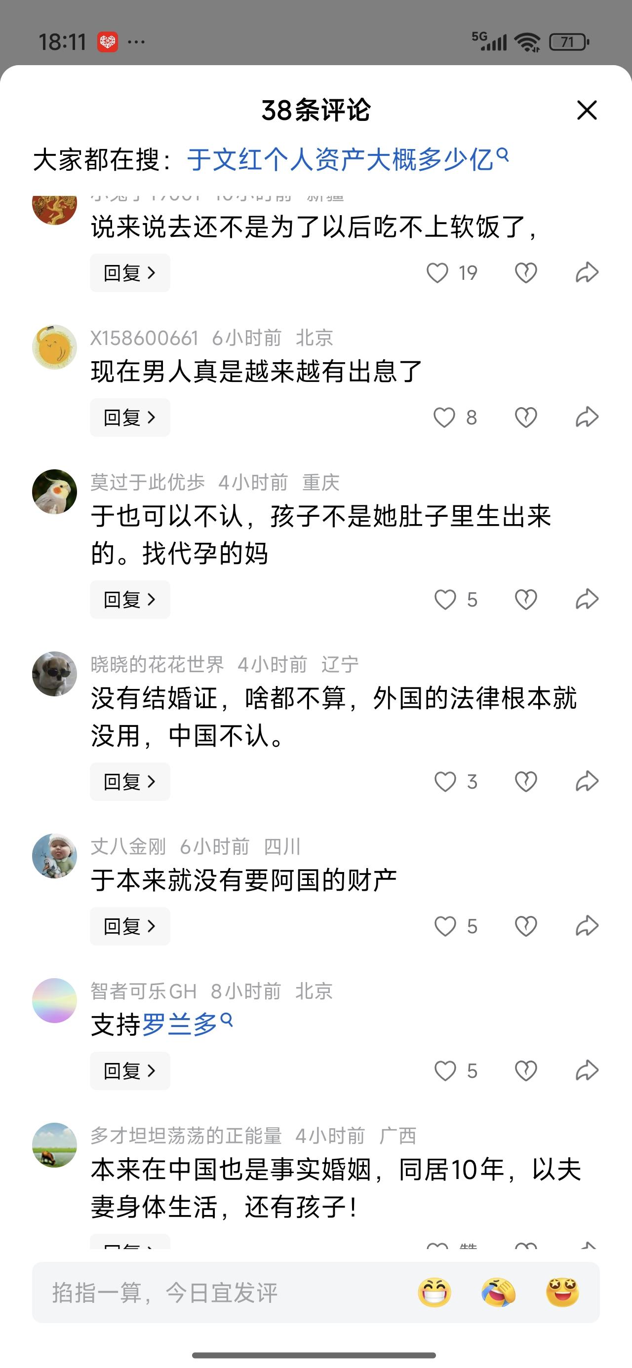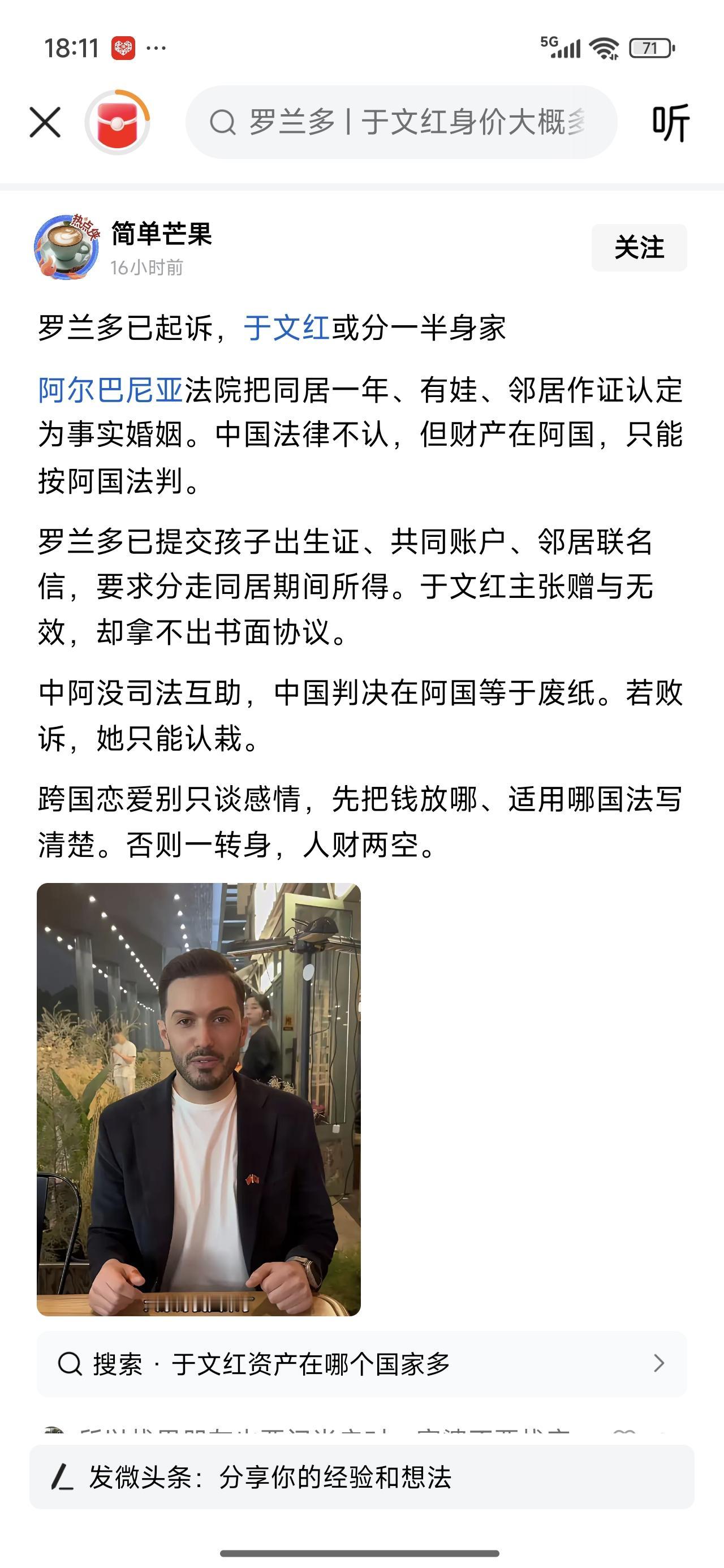 罗兰多起诉,阿尔巴尼亚这里,只要有事实婚姻,又有邻居证言,有娃。在那边打官司胜诉的概率很大。 如果是这样,于美女恐怕要分点财产给到罗了。 他这些年,也付出了青春,从一个嫩超的大小伙子,变成了眼窝深陷的大叔,脸上明显有了岁月的痕迹,女生那么有钱,买下单能怎样。 哈哈,青春有磨损的费用不止是女方有的,男方也有的。女的曾说,她四十多也有青春。四十多的还是要差一点吧!普通女生四十多五十多已经老了,起码是开始老了。 她做美业,是会显得年轻些罢了。 还有个儿子,两个人的,给点生活费喽!冤吗?这些年,男的不是什么都没干,一直躺着的吧。