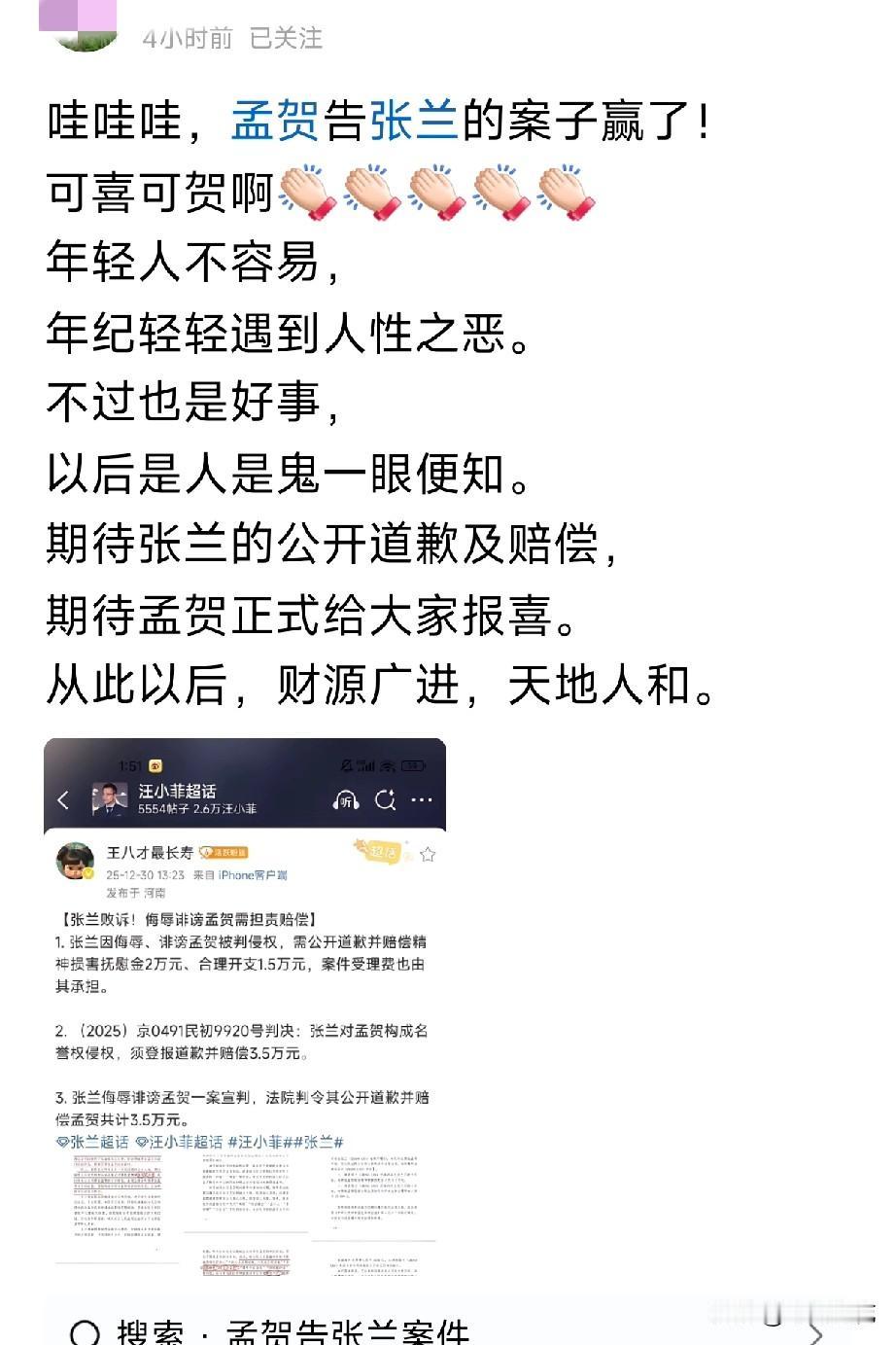 恭喜孟贺!他赢的不仅是官司,更是证明他所说的话是真实的,他没有说谎,更没有满嘴跑火车。 大S被人恶评,都是谁的“功劳”?一些认知低下的人,到现在都还在人云亦云地诋毁大S,说她21告,我们又有谁看到过?倒是有些人动不动说告这个告那个,动不动振振有词地说赢了这个那个,谁又看到几个赢了? 哎!钱要赚,但一定要善良、光明正大地赚!互联网成了哭穷卖惨、网暴他人演好人设的剧场了。 希望网民擦亮眼睛,平台一定要线下核实,如果扶持错了,带坏网风。