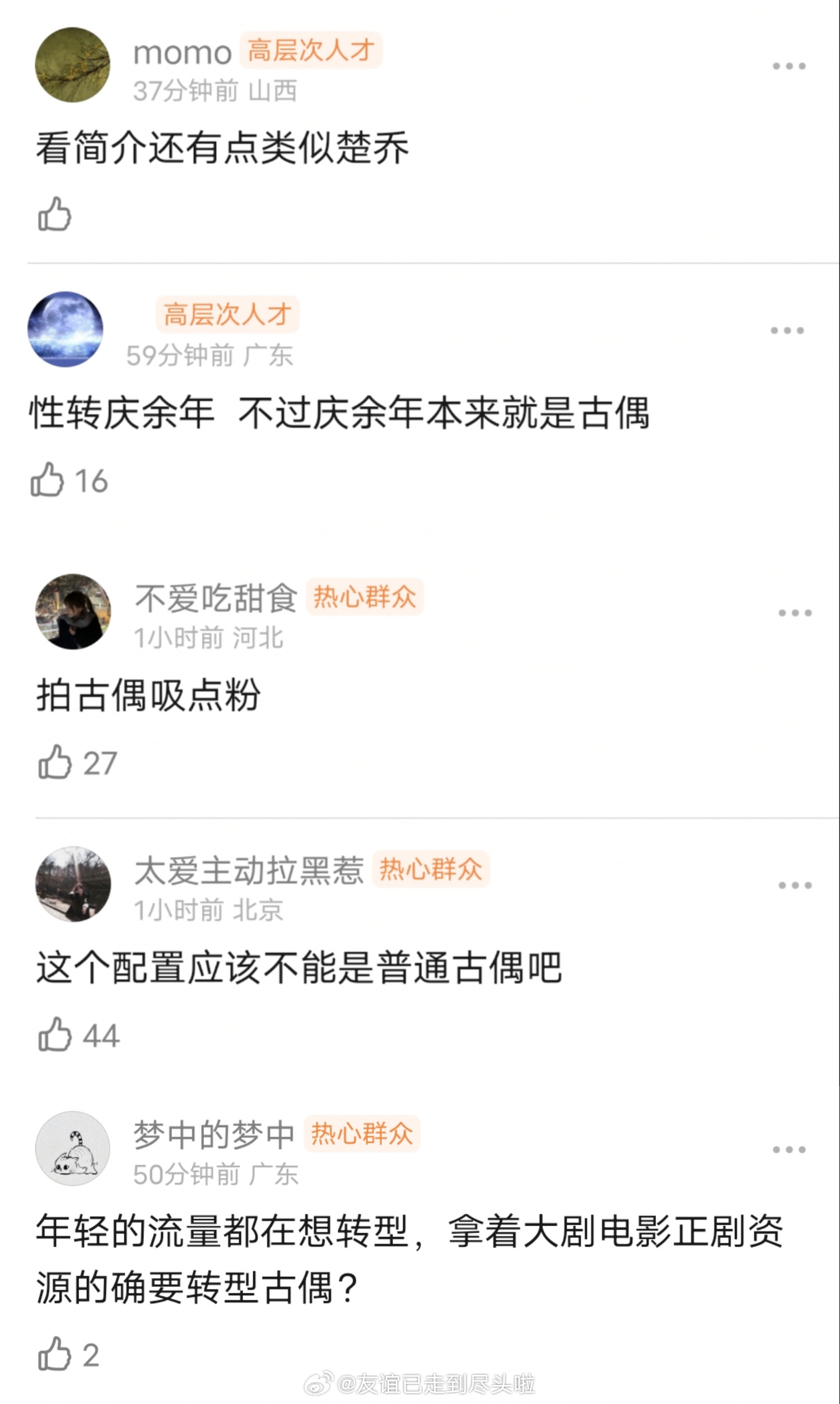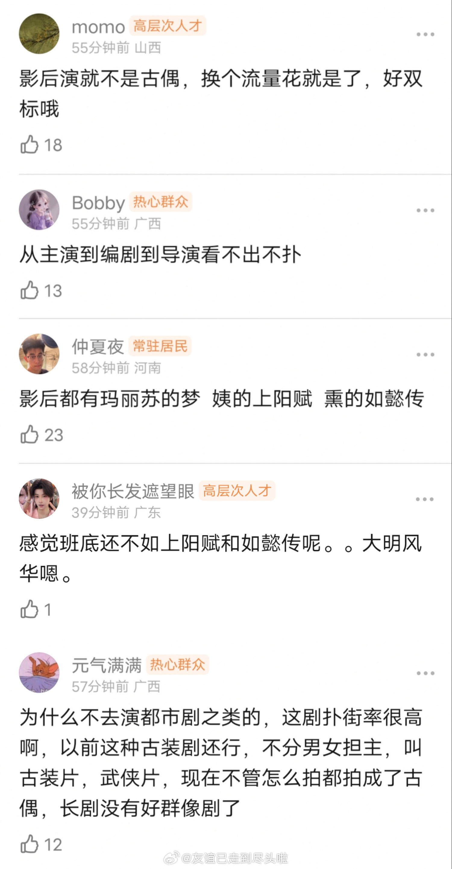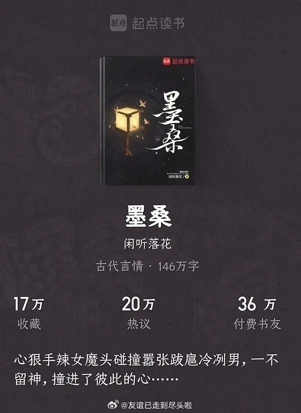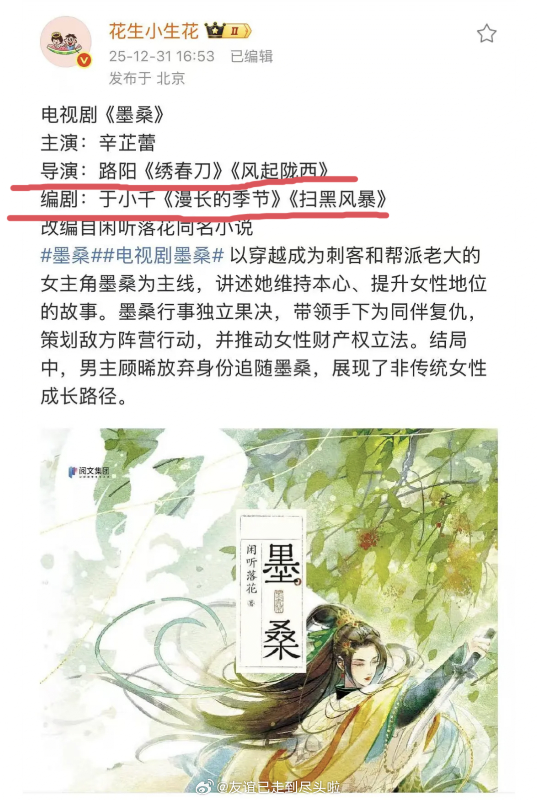 辛芷蕾的新饼《墨桑》,导演路阳,编剧代表作《漫长的季节》《扫黑风暴》。原著是女频言情,穿越女一路大开金手指的故事,重点刻画了女刺客的成长路径,类楚乔传,也有点像性传版庆余年。网友都无法理解威尼斯影后为什么要接古偶?