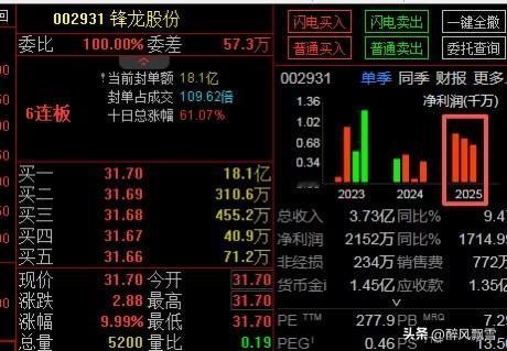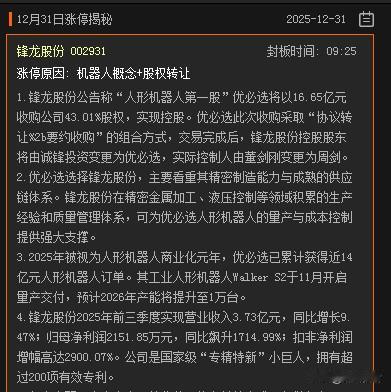 12月31日跨年龙已确认 跨年主线:商业航天,跨年龙竞然不在主线! 胜通能源关小黑屋,嘉美已触发10日4次异动。 目前高标:锋龙股份和大业股份,异动2次。 锋龙和胜通相同均为股权转让,胜通12板,锋龙跨年龙地位确立!大业为板块龙头! 锋龙股份(002931)成跨年龙核心逻辑鲜明,依据如下: 其一,股价斩获6连板,十日涨幅超61%,18.1亿封单展现资金高度认可,封单金融及封单占比10960.62 %,史无前例。10日内仅2次异动,监管风险相对可控; 其二,优必选股权切入人形机器人赛道,标的量产落地+公司200余项专利形成技术壁垒,业绩高增叠加“专精特新”资质夯实基本面; 其三,卡位机器人+股权转让跨年独苗题材,复制胜通能源走势。25年机器人商用元年,业绩突出,机器人第一股! 个人判断,一笑了之!不作为投资依据!