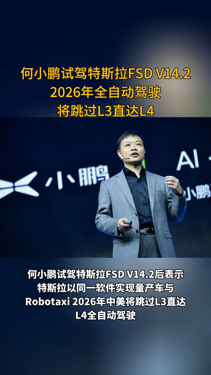 何小鹏试驾特斯拉FSD V14.2,2026年全自动驾驶将跳过L3直达L4。