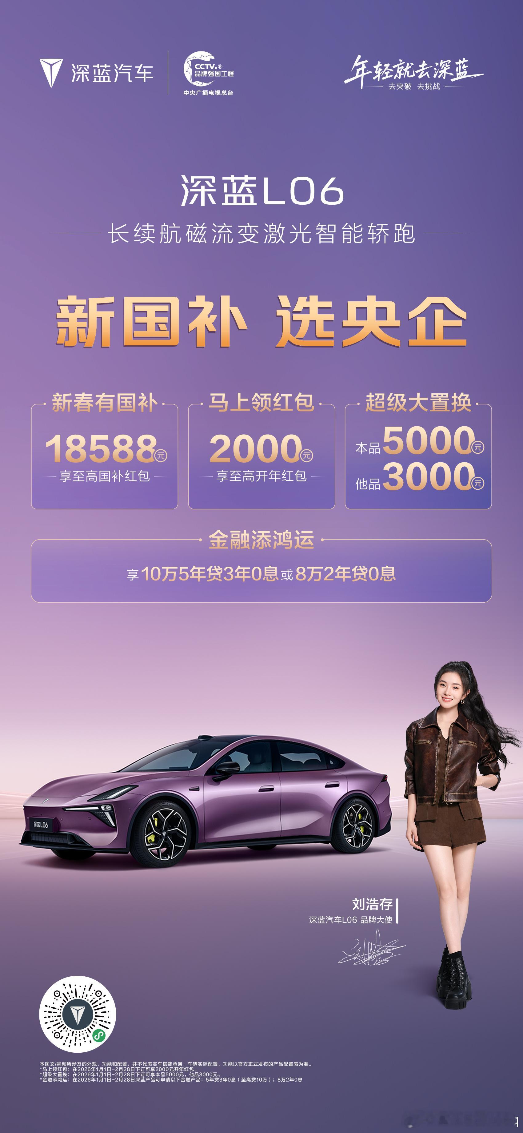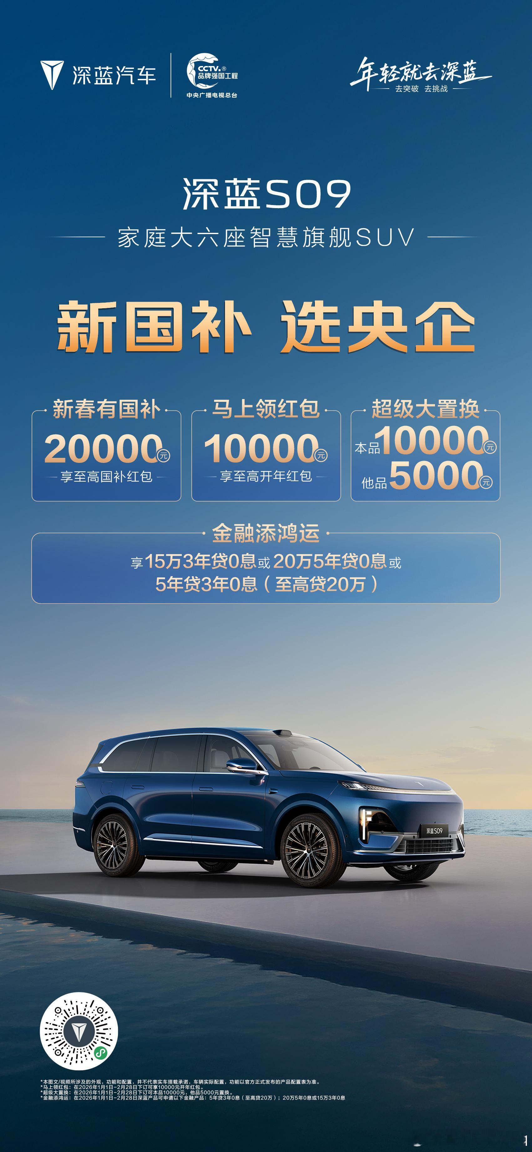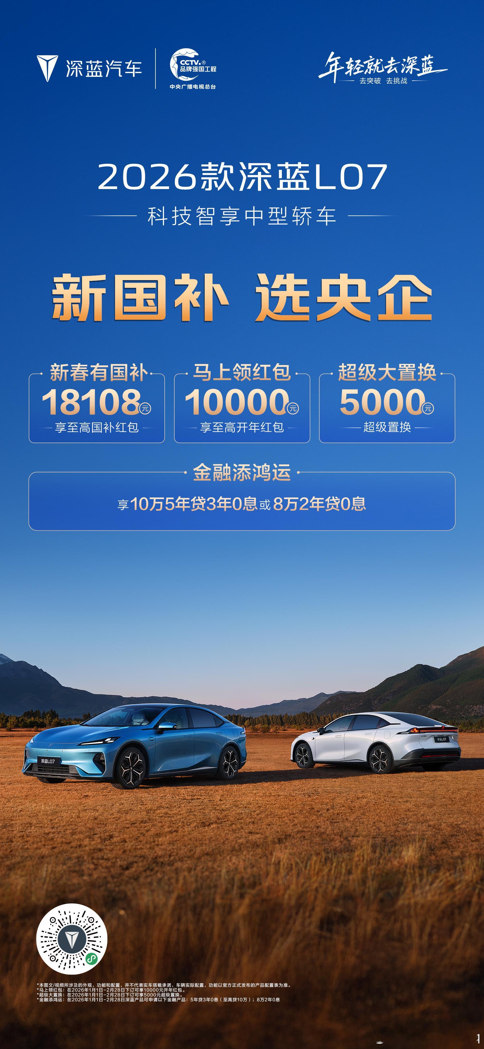 新央企,响应新国补,诚意献礼!领国补:至高20000元,领红包:10000元享置换:至高8000元,分期付:至高5年0息实力宠粉,轻松开启新年!新国补选央企深蓝汽车