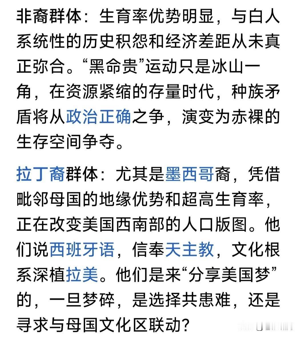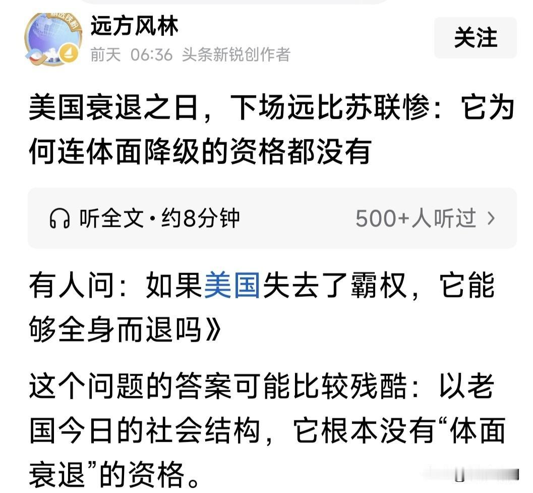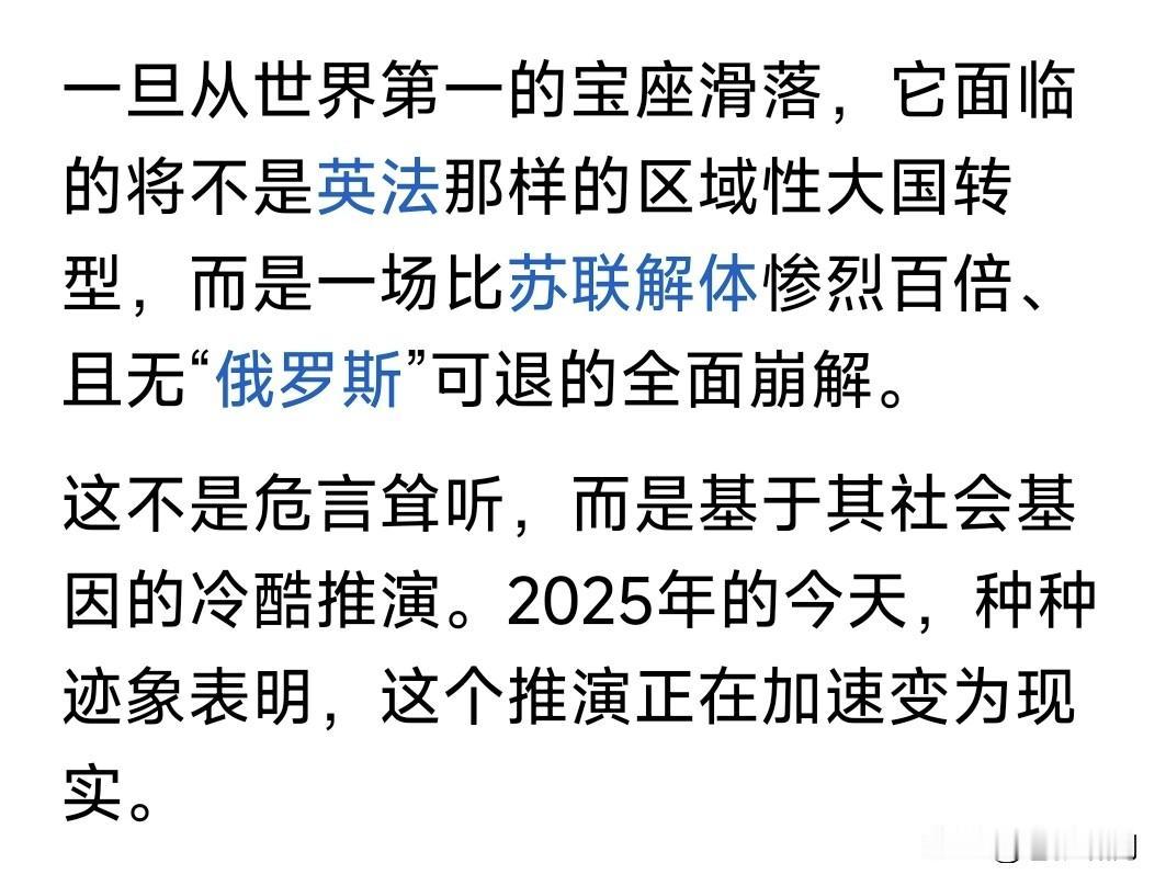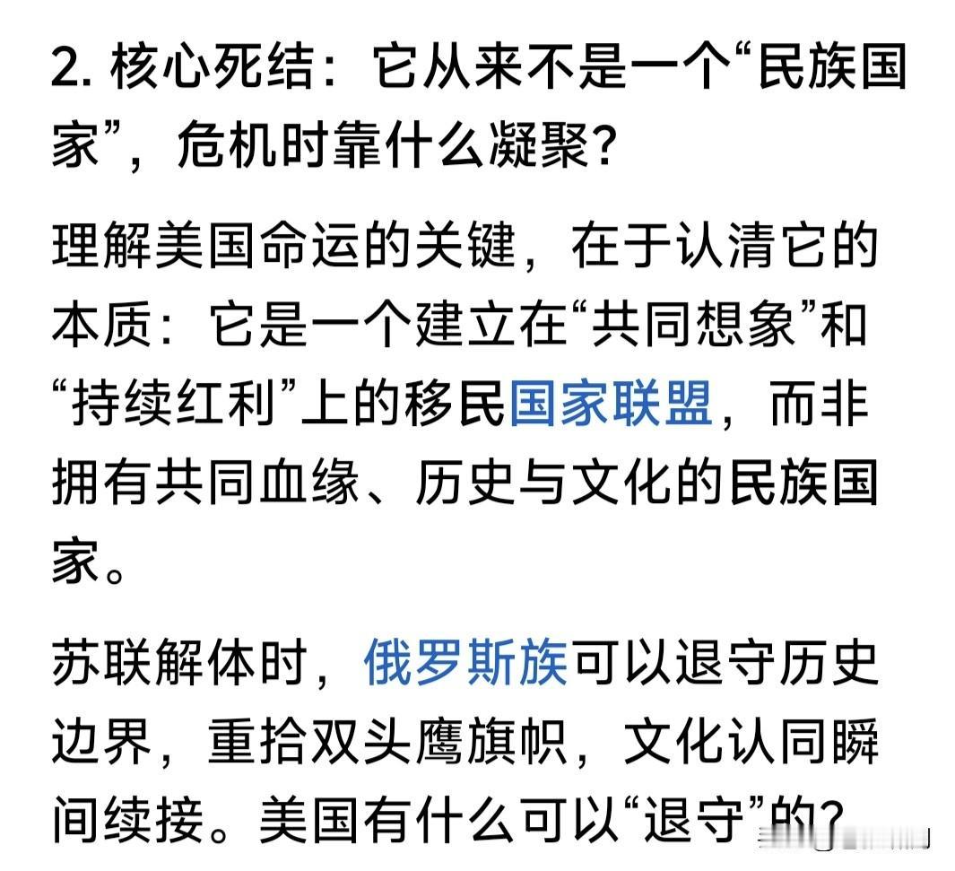 网友预言:老美衰退之日,下场比苏联还要惨,连体面降级资格都没有!为何如此?因其不同的社会结构等原因。 1.核心死结:它不是单一民族国家,而是白人为主的大杂烩。多年开放政策,大量涌入亚裔非裔拉丁裔伊斯兰裔移民。白人占多数时,尚可保持社会稳定。一旦非拉伊裔占多数,将有动乱危机。 2.“黑白对立”与“多维撕裂”。长期阶层固化,导致阶层对立。华尔街财阀掌控财富,贫富差距拉大,民粹情绪抬头。极易产生对立,引发社会动荡。 3.“觉醒意识”与“传统价值”摩擦,围绕“历史”“性别”“控枪”的争执愈演愈烈,深入社会家庭,极易擦出火星。 4.权力重叠与管理松散,“三权分立”扯皮掣肘,政府与州互不隶属!“红州”与“蓝州”倾向相反,在选举、移民、堕胎等方面几乎对立,容易出问题。 5.不确定因素叠加。俄乌战争等地区冲突此起彼伏,美国消耗很大无力控制。中国崛起让老美惊慌失措,但又无法遏制。多因素叠加,美迟早衰退! 不得不说,网友分析得很有道理。这些因素确实存在,但有一点可以肯定,至少现在还是世界老大,没有国家能与之抗衡。谁与之硬刚没好果子吃! 对于中国与世界各国关系,苍狼一直赞同小平同志制定的方针:改革开放,融入世界,互相学习,合作共赢!原则问题绝不退让,求同存异谋发展。 中国与美欧关系,是世界最重要双边关系!中国与日韩澳以,是亚洲最重要双边关系!前者事关融入世界,后者事关稳定亚洲,实现持续发展目标! 不管黑猫白猫,捉住老鼠才是好猫!实践是检验一切真理的标准!发展才是硬道理!我们发展的目标,不是与谁争老大比高低,而是为了强国富民!美国兴衰是他们的事,与我们何干呢? …………