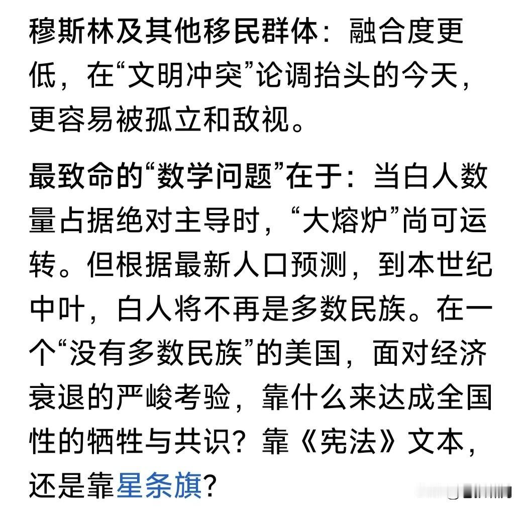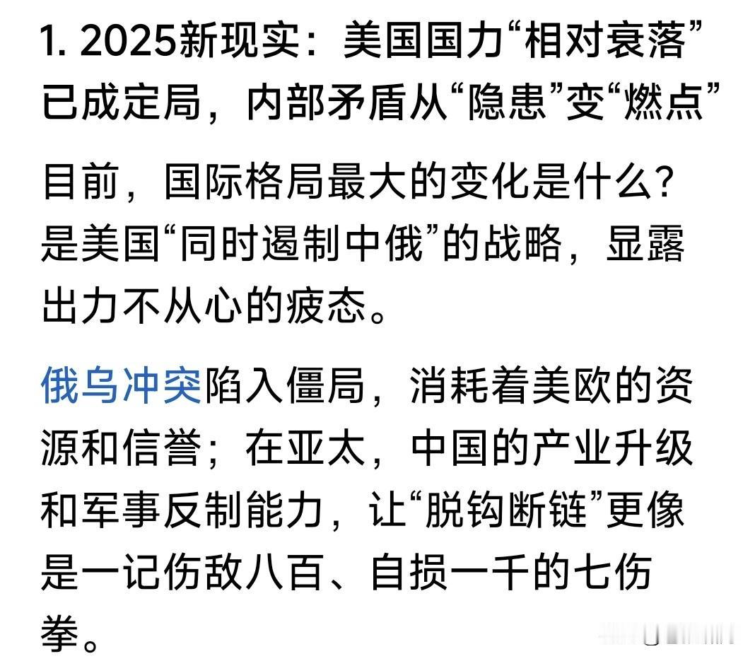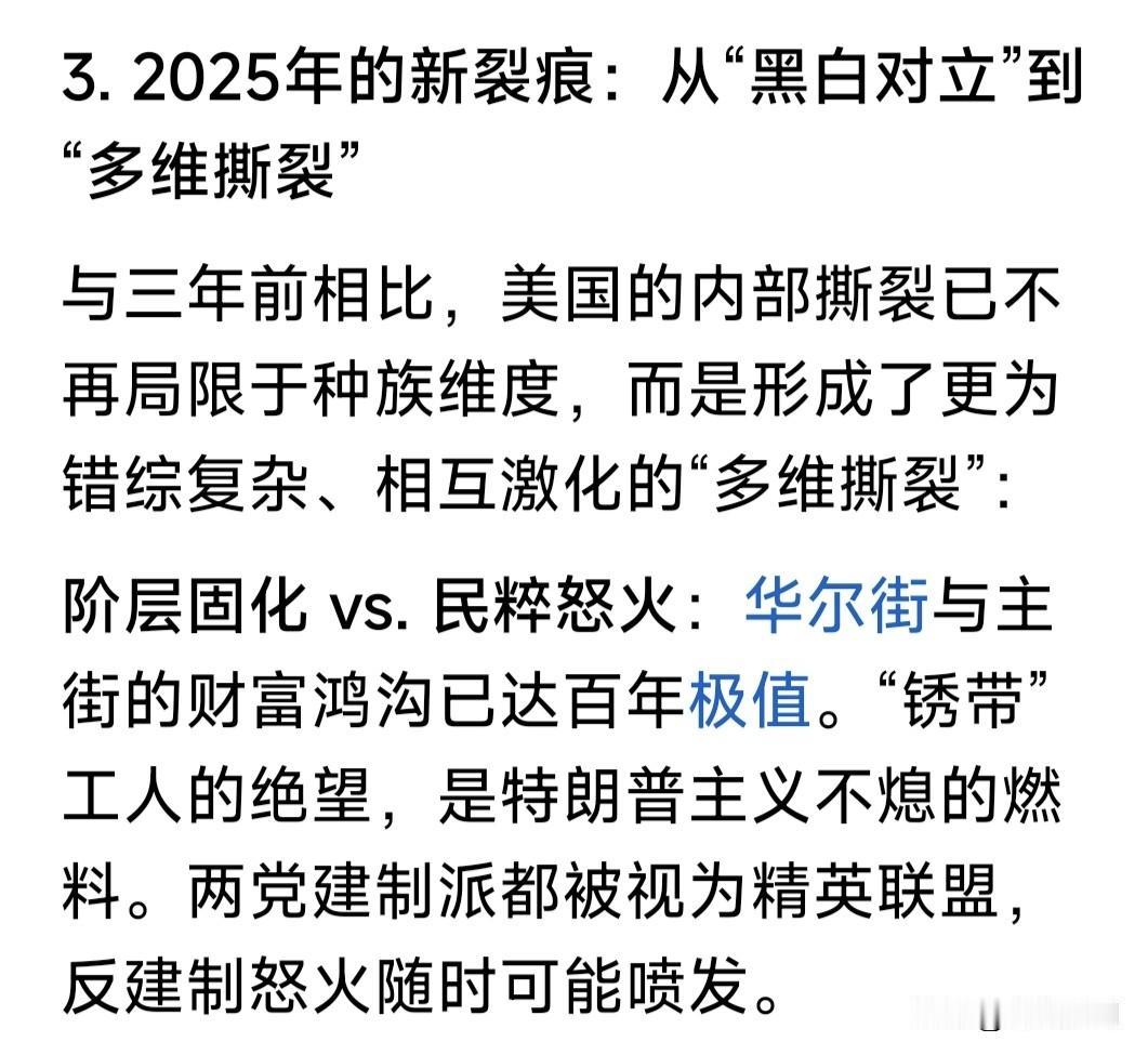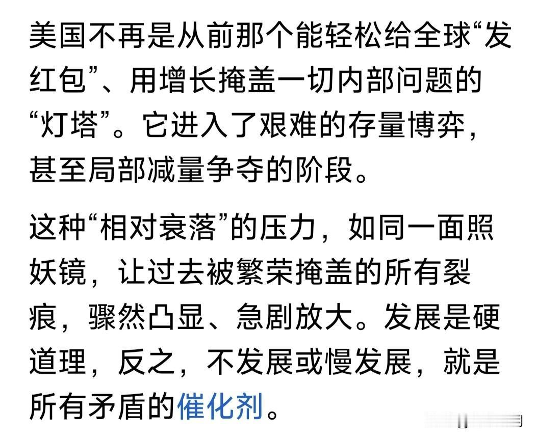网友预言:老美衰退之日,下场比苏联还要惨,连体面降级资格都没有!为何如此?因其不同的社会结构等原因。 1.核心死结:它不是单一民族国家,而是白人为主的大杂烩。多年开放政策,大量涌入亚裔非裔拉丁裔伊斯兰裔移民。白人占多数时,尚可保持社会稳定。一旦非拉伊裔占多数,将有动乱危机。 2.“黑白对立”与“多维撕裂”。长期阶层固化,导致阶层对立。华尔街财阀掌控财富,贫富差距拉大,民粹情绪抬头。极易产生对立,引发社会动荡。 3.“觉醒意识”与“传统价值”摩擦,围绕“历史”“性别”“控枪”的争执愈演愈烈,深入社会家庭,极易擦出火星。 4.权力重叠与管理松散,“三权分立”扯皮掣肘,政府与州互不隶属!“红州”与“蓝州”倾向相反,在选举、移民、堕胎等方面几乎对立,容易出问题。 5.不确定因素叠加。俄乌战争等地区冲突此起彼伏,美国消耗很大无力控制。中国崛起让老美惊慌失措,但又无法遏制。多因素叠加,美迟早衰退! 不得不说,网友分析得很有道理。这些因素确实存在,但有一点可以肯定,至少现在还是世界老大,没有国家能与之抗衡。谁与之硬刚没好果子吃! 对于中国与世界各国关系,苍狼一直赞同小平同志制定的方针:改革开放,融入世界,互相学习,合作共赢!原则问题绝不退让,求同存异谋发展。 中国与美欧关系,是世界最重要双边关系!中国与日韩澳以,是亚洲最重要双边关系!前者事关融入世界,后者事关稳定亚洲,实现持续发展目标! 不管黑猫白猫,捉住老鼠才是好猫!实践是检验一切真理的标准!发展才是硬道理!我们发展的目标,不是与谁争老大比高低,而是为了强国富民!美国兴衰是他们的事,与我们何干呢? …………