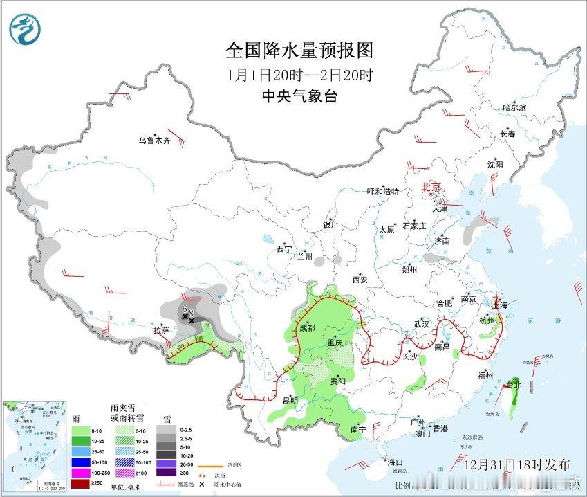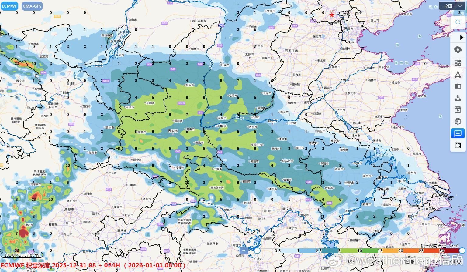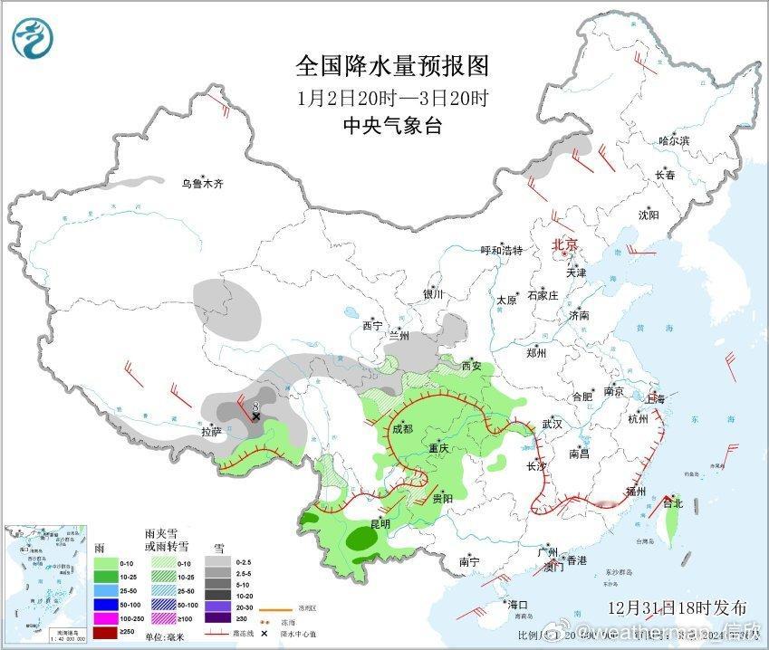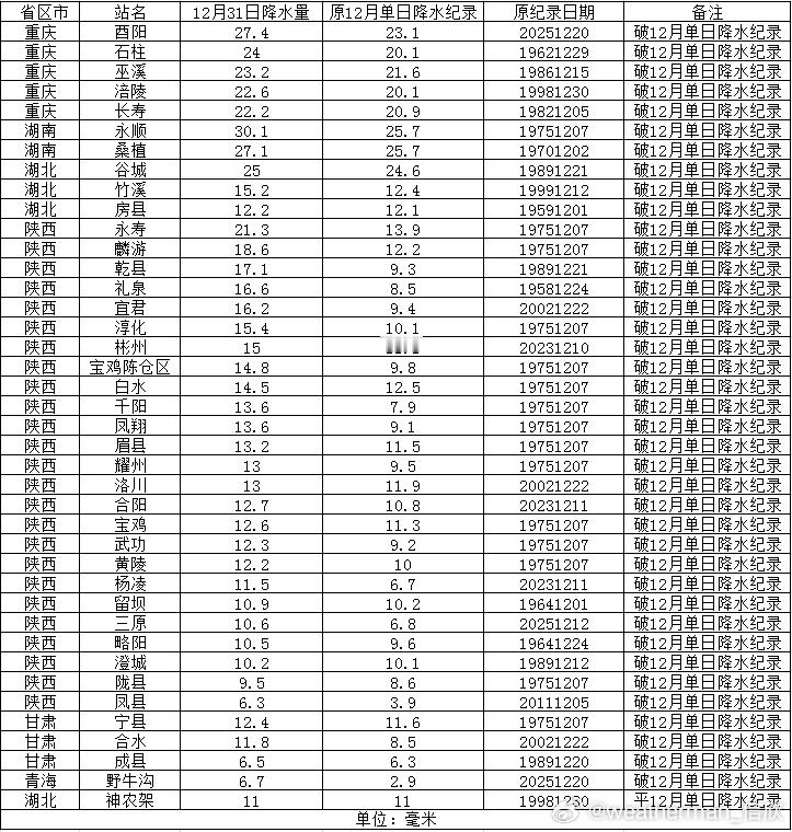 【雨雪】昨晚到今天,我国黄河以南出现了大范围降水。重庆湖南部分站点出现大雨,陕西和周边一带出现大雪-暴雪。重庆湖南湖北陕西甘肃青海,有39个站点打破了12月单日降水量纪录(图2)。今晚20时,部分站点积雪达到了10厘米以上(厘米):陕西宜君15、淳化13、彬州13、华山12、白水12、洛川11、长武11、华州11、旬邑10、永寿10;甘肃西峰10;河南唐河10;此外湖北谷城8厘米。今晚到明天,降雪向东推进,强降雪核心区将转移到大别山区。降雨总体会向南收缩,广西北部还有些中到大雨。主要的降水出现在今夜-明晨,明天白天开始,雨雪逐渐收敛。今晚中央气象台继续发布暴雪蓝色预警:预计今晚到明天,河南东南部、安徽中南部、湖北东北部等地的部分地区有大雪,局部地区有暴雪(10~14毫米)。上述部分地区新增积雪深度2~7厘米,局地可达10~15厘米。这轮降水之后,1月2-3日还有高空槽东移,槽前的偏南气流,一路将水汽输送到陕甘宁一带。因此甘肃东南部、宁夏南部、陕西南部,在3日前后可能还有降雪过程。但总体强度和降雪范围弱于目前的过程。另外未来西南暖湿气流活跃,西南地区的阴雨雪也会频繁。而元旦假期东部地区晴天居多。