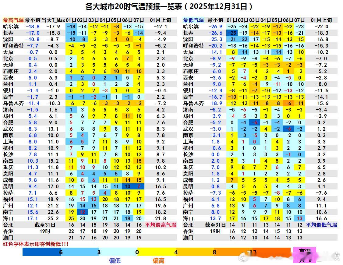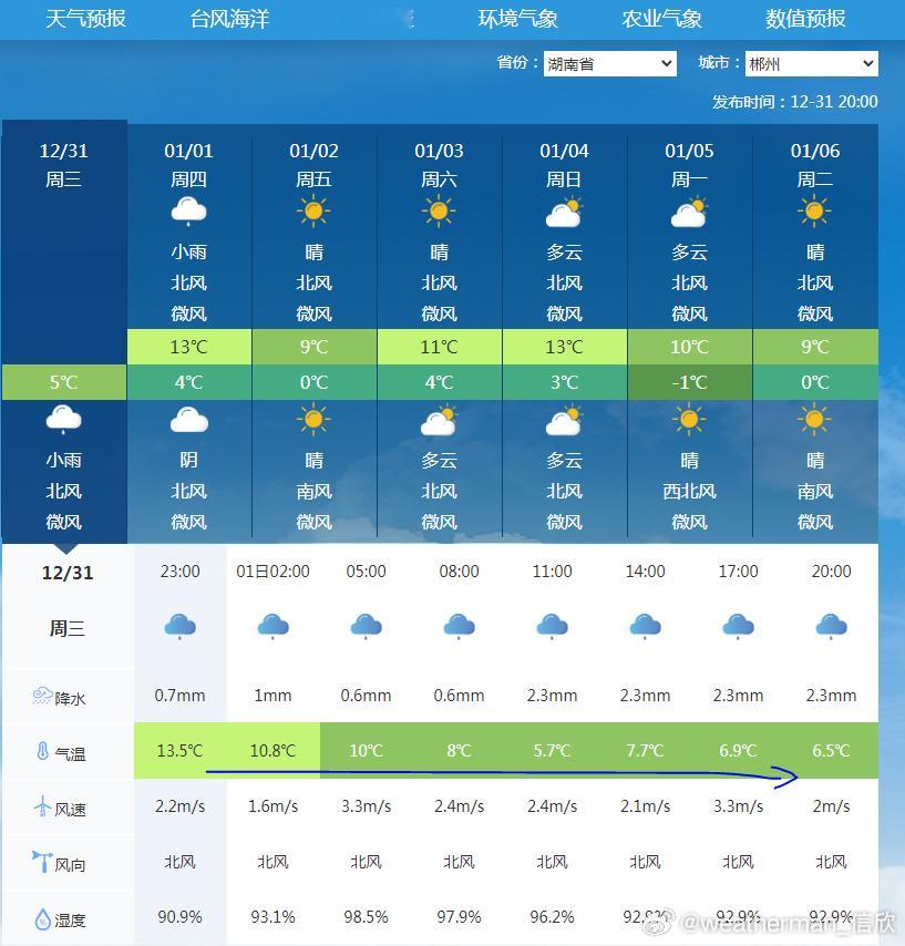 【降温&创新低】明天冷空气继续南下,配合阴雨,导致南方出现明显降温。其中云南东部、贵州西南部、广西多地、湖南中部和南部、江西、福建西北部、浙江中南部、安徽南部,可能出现6-10℃降温,局地降温超12℃。湖南郴州一带,明天可能成为核心降温区。而且会出现气温倒降,明天下午比今晚和明天凌晨还低。从1月2日开始,我国多地白天的气温有所回升,但夜间升温不明显,甚至在降水之后,放晴导致的夜间晴空辐射还会有降温。而且1月3-5日,还有冷空气影响我国。因此元旦假期,黄河以南多地,会出现气温创新低的情况。1月3日晨,最低温度0℃线将南压至江南南部。今晚预报给出的部分大城市气温创新低情况:1日最高气温:西安1℃、郑州5℃、合肥5℃、南京5℃、武汉6℃、上海6℃、杭州7℃、长沙7℃、重庆11℃。2日最高气温:贵阳4℃、南京4℃、上海5℃、拉萨7℃、成都8℃、南昌9℃、重庆10℃、南宁12℃、福州15℃。3日最高气温:西宁零下2℃、西安0℃、兰州0℃、拉萨5℃、成都6℃、重庆9℃、福州12℃。1日最低气温:北京零下9℃、郑州零下4℃。2日最低气温:石家庄零下7℃、济南零下6℃、郑州零下5℃、西安零下4℃、贵阳1℃、上海1℃。3日最低气温:合肥零下6℃、南京零下5℃、上海0℃、南昌1℃、福州5℃、广州6℃。注意保暖、小心感冒。