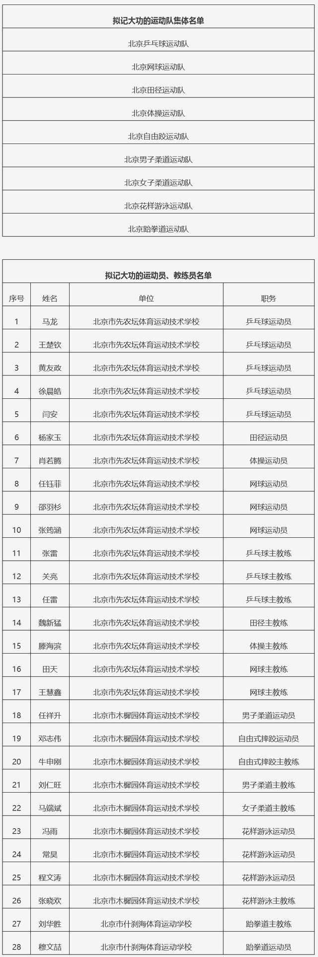 12月31日,据北京体育消息,在第十五届全国运动会,北京体育健儿顽强拼搏、团结协作,圆满完成参赛任务,为首都体育事业再创佳绩。依据《北京市事业单位工作人员奖励实施办法》等文件规定,市人力资源社会保障局会同市体育局对在第十五届全国运动会上作出杰出贡献的北京运动员和教练员,开展记大功奖励工作。根据奖励工作部署,在有关单位积极推荐的基础上,经综合评审、统筹考虑,确定北京乒乓球运动队等9个集体,马龙等28位同志拟记大功对象。