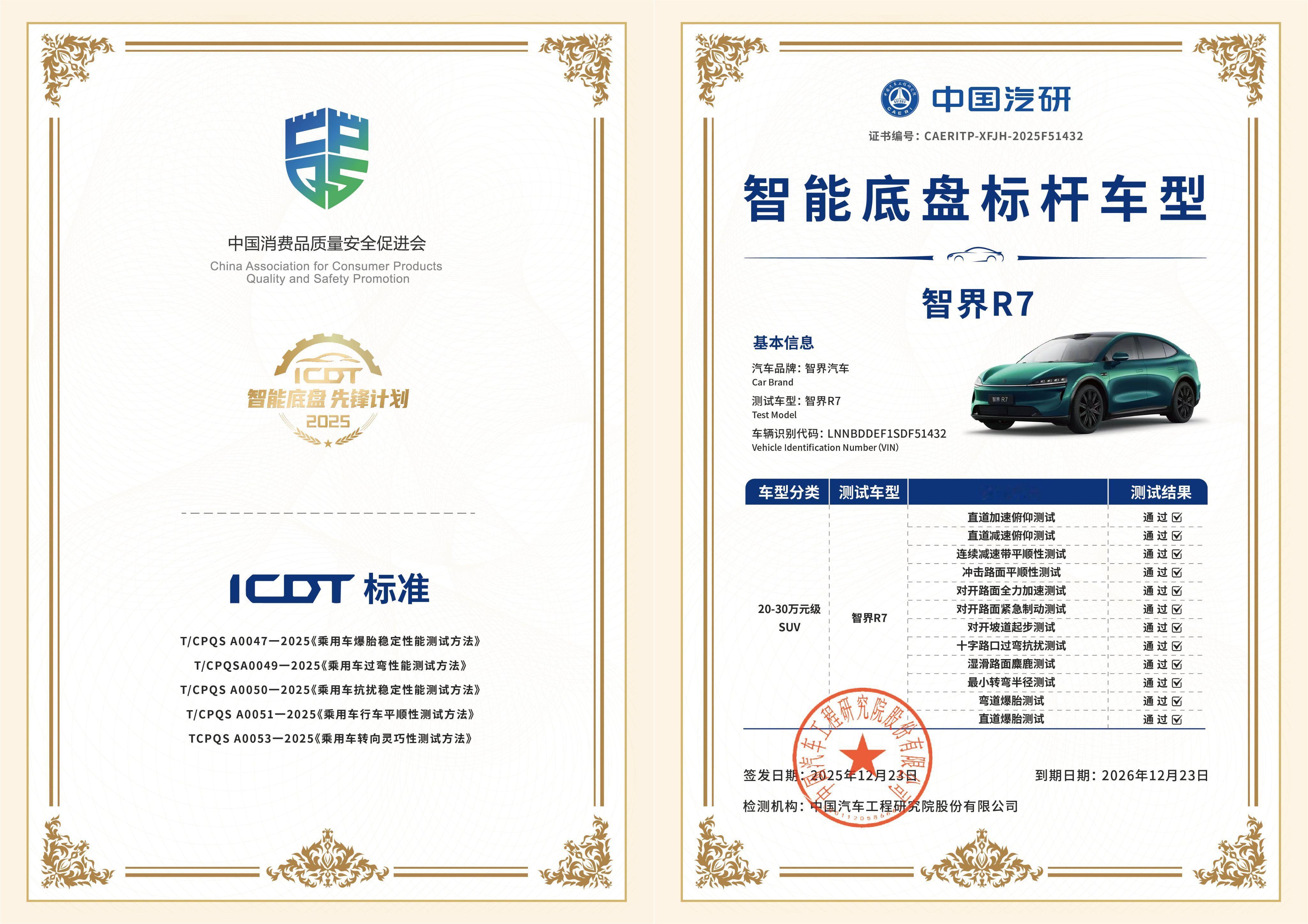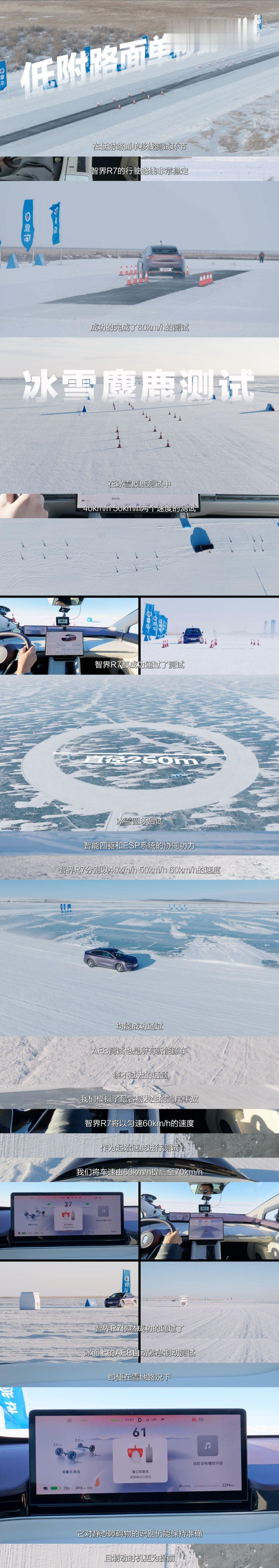 智界R7获智能底盘标杆认证 在中国汽研联合中国汽车工程学会智能底盘分会发起的“2025智能底盘先锋计划”中,搭载华为途灵平台的智界R7凭借卓越表现斩获“标杆车型”认证。该先锋计划邀请业内权威专家组成评审团,基于ICDT智能底盘综合性能评价体系,通过三大维度13种工况的严苛测试,对参评底盘的操控性、舒适性、安全性进行全方面验证。首批汽车智能底盘实测报告出炉其实做为智界 R7 车主,我个人对于智界 R7 的底盘表现还是很满意的,智界 R7 搭载由华为主导开发的自主智能数字底盘平台。这套智能数字底盘平台不仅仅是有较强的硬件配置,还有较强的软件赋能,真正的实现软硬一体化结合。利用激光雷达、摄像头等传感器硬件来提前“看路”,根据不同的路况提前调整车辆底盘,该软的软、该硬的硬,所以我的 R7 日常开起来灵活性、舒适性以及运动性兼顾的不错。其次新能源汽车,大家也比较关心低温环境下的表现,易车也是针对性的做了测试。低温续航测试,在空调设置为 22℃ 保证车内依然舒适温暖的情况下,智界R7跑了519.8公里后才耗干了全部电量,续航折现率为70.63%,很猛。如果你像我一样在深圳生活,那 100 度电的智界 R7 在我的出行场景中甚至能做到一个月充一次电。低温充电方面,智界 R7 从30% 充到80% 用了14分42秒,其中峰值功率达到285kW,这个低温充电速度还是能看出来智界 R7 在三电方面的实力的。除此之外,全系标配华为乾崑智驾ADS 4的智界 R7 成功通过了 70km/h 冰面上的AEB自动紧急制动测试,场景覆盖度过于丰富。所以对于智界 R7 的产品力我个人是比较认可的,这也是智界连续三个月交付破万的重要原因,真“六边形战士”。