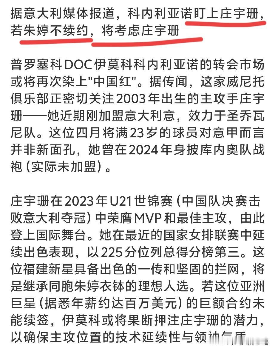 朱婷的球队看上庄宇珊的可能性不大,毕竟加比已经成功续约科内利亚诺女排[呲牙] 传闻也太离谱了,朱婷还没确定下赛季的去向,再说庄宇珊和加比几乎是同类型,而且费内巴切说庄宇珊签的是2年合同。固然,炒作对庄宇珊的身价也是好事,希望庄宇珊打好每场比赛,用实力征服意甲。科内朱婷 意甲女排