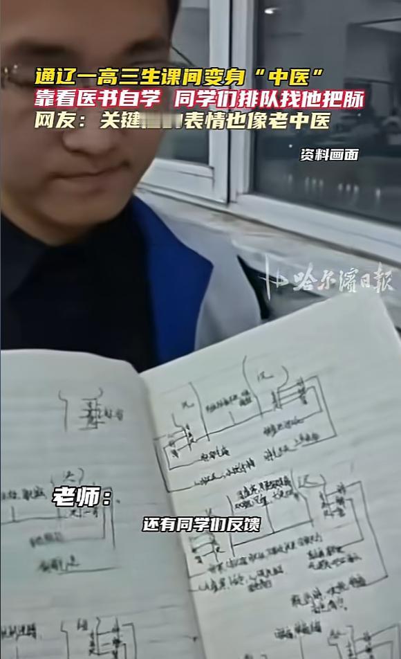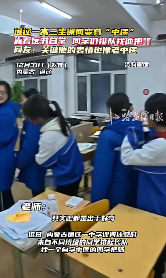 “这个学生火了!”近日,内蒙古通辽,一男生自学中医后,竟在教室开起了“诊室”,在课间为同学们把脉,吸引众多人排队体验,并且看过的都表示诊断结果比较准确,和医院大夫说得差不多。网友:校服都压不住老中医的气质! 了解情况的人都知道,这所学校的高三学习氛围本来就紧张,下课铃声一响大多数学生都想着抓紧时间歇口气,要么趴在桌上补觉,要么急匆匆跑出去接水、上洗手间,教室里乱糟糟的全是放松的劲儿。 可唯独这间高三教室,一到课间就画风突变,大家不吵不闹,反而围着一个男生的课桌排起了队,一个个都乖乖地伸出手腕,眼神里还带着点期待。 这个成为焦点的男生,穿着和大家一样的蓝白校服,可举手投足间的沉稳劲儿,却和同龄人的活泼截然不同,他坐得笔直手指搭在同学的手腕上,眉头微微蹙起,屏气凝神的样子,像极了经验丰富的老中医,网友们看了视频都忍不住打趣:“这哪是高中生啊,分明是老中医微服私访到了校园,连宽大的校服都压不住那股子专业范儿!” 千万别以为他是一时兴起玩“过家家”,这男生的中医本事,全是靠自己实打实自学来的,根据12月31日媒体披露的消息,虽然身处高三紧张的备考阶段,他却挤出了大量碎片化时间钻研中医。 一开始就是被中医文化的魅力吸引,好奇老祖宗传下来的“望闻问切”到底有多神奇,没想到这股好奇劲儿一上来就收不住了。 他利用课间、午休这些零散时间,一头扎进中医基础理论里,不仅啃相关的古籍书本,还跟着网上的专业课程一步步学,连诊脉的手法都是对着网课一丝不苟练出来的。 刚开始的时候,他也只是在同学不舒服的时候,凭着学到的皮毛给点调理建议,没想着“行医”。可让人意外的是,他这些从书本和网课里摸索来的知识,竟然真的管用。 久而久之同学们都知道了班里有个“懂中医”的同学,谁要是觉得身体不舒服,或者脸色不好看,都会主动找他问问,慢慢的找他咨询的同学越来越多,大家都特别信任他。 面对越来越多的需求,他索性把“免费诊所”直接开在了自己的课桌上,课间给同学们把脉问诊,成了他独有的休闲方式。 最让人佩服的是,这位“小大夫”是真的有两把刷子,在大家印象里,生病去医院听医生的诊断才靠谱,可当这些专业的判断从朝夕相处的同学嘴里说出来时,大家都格外震撼,不少接受过他诊疗的同学都说他的诊断结果特别准,很多细节都和正规医院大夫说的差不多。 有同学分享自己之前总觉得乏力、没精神,去医院检查后大夫说有点气血不足,找这个男生把脉,他也准确说出了自己气血虚的问题,还给出了调整作息和饮食的建议,照着做了几天确实舒服了不少,也正是这份准确率,让他的“教室诊所”成了学校里的“网红打卡点”,每天课间的人气比外面正经的小诊所还旺。 这事儿传到网上后,瞬间引发了全网热议,评价几乎一边倒的好评,大家都被这个男生的钻研精神打动了,纷纷点赞:“现在的年轻人愿意沉下心学传统文化,太难得的!”“穿着校服诊脉的样子又认真又可爱,未来可期啊!”还有不少网友反复刷他诊脉的视频,调侃道:“校服都藏不住他的‘老中医气质’,这沉稳劲儿比不少成年人都强。” 不过舆论里也有不少理性的声音,大家在称赞他的同时,也不忘提醒他分清主次,毕竟高三是备战高考的关键时期,学业压力本来就大,网友们都苦口婆心地说:“钻研中医特别值得鼓励,但现阶段还是要以学习为主,合理分配时间,可别因为‘行医’耽误了备考。” 大家都明白他要是真的想成为一名合格的中医,未来还有很长的路要走,现在先把基础文化课学好,考上理想的大学深入钻研,才是通往中医殿堂的稳妥路子。 其实这事儿不只是一个有趣的校园热点,更能看出现在年轻人对传统文化的态度转变,曾经大家觉得晦涩难懂、只有老一辈才喜欢的中医,如今正以这样鲜活的方式走进00后的生活。 不用刻意宣传,一个高中生愿意主动拿起中医古籍、认真练习诊脉,就是对传统文化最好的传承,当然也希望这个男生能平衡好学业和兴趣,既保留这份对中医的热爱,也能在高考中取得好成绩,未来真正实现“悬壶济世”的梦想,毕竟这样有热爱、肯钻研的年轻人,不管走哪条路,都值得被期待。 (信息来源:《通辽一高三生课间变身“中医”靠看医书自学同学们排队找他把脉,网友:关键他的表情也像老中医》哈尔滨日报)
