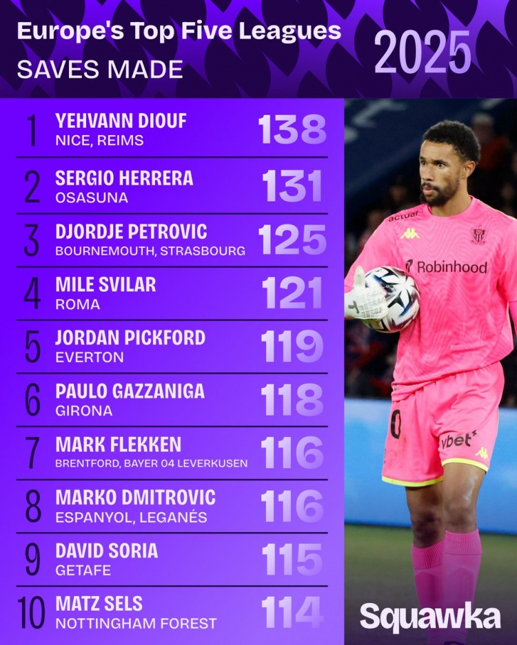直播吧1月1日讯Squawka列2025年五大联赛门将扑救次数榜,尼斯门将叶赫万·迪乌夫以138次居首。
