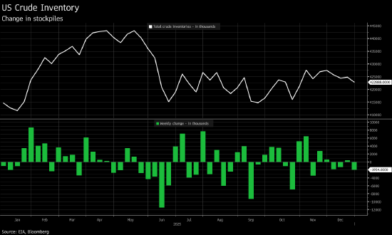 截至2025年12月26日当周,美国原油总库存(不包括战略石油储备)降至42288.8万桶,为2025年10月31日以来最低水平。当周原油库存减少193.4万桶,为2025年11月14日以来的最大降幅。