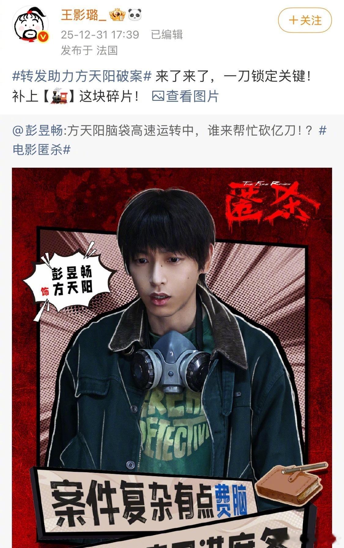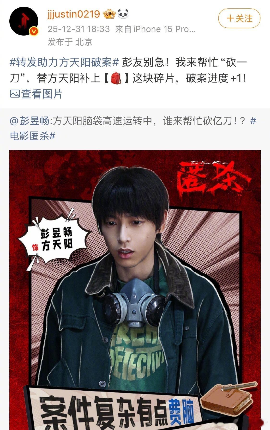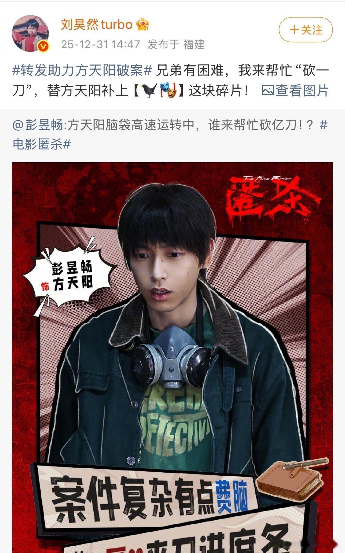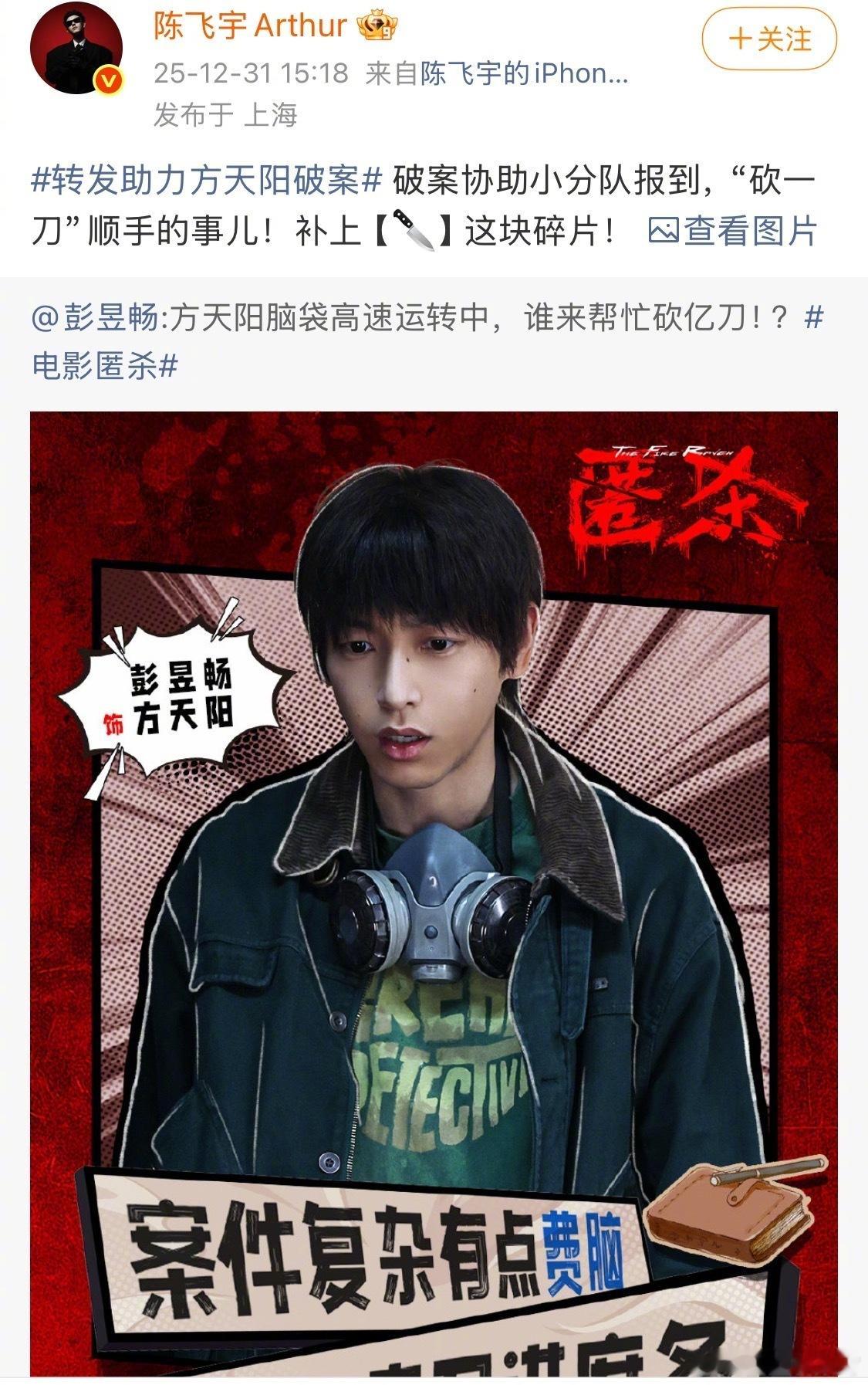 大家就这样陪彭昱畅胡闹彭昱畅为宣传新片《匿杀》搞了个“破案砍一刀”,陈飞宇、魏大勋、刘昊然等好友集体转发接力,这波操作简直是朋友圈团建现场,人缘也太好了!