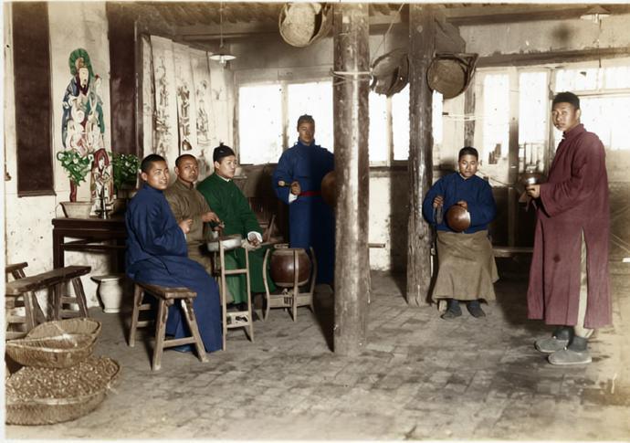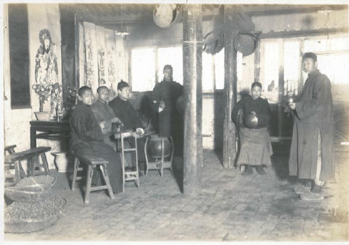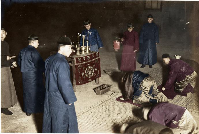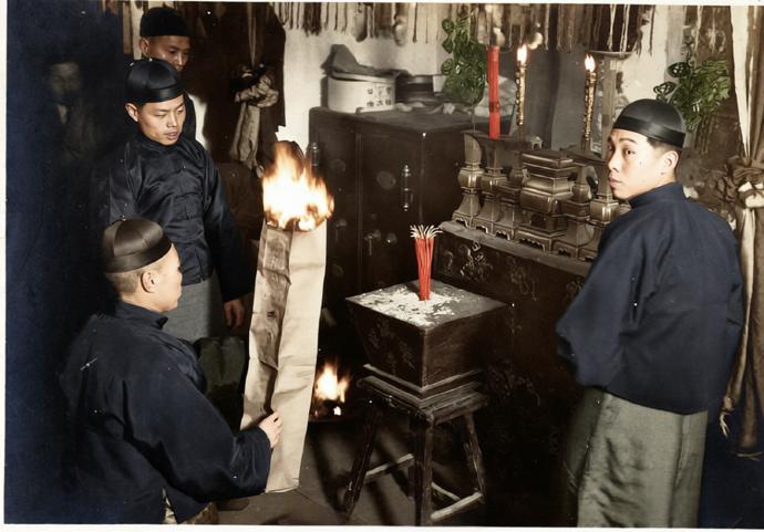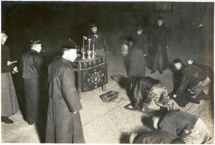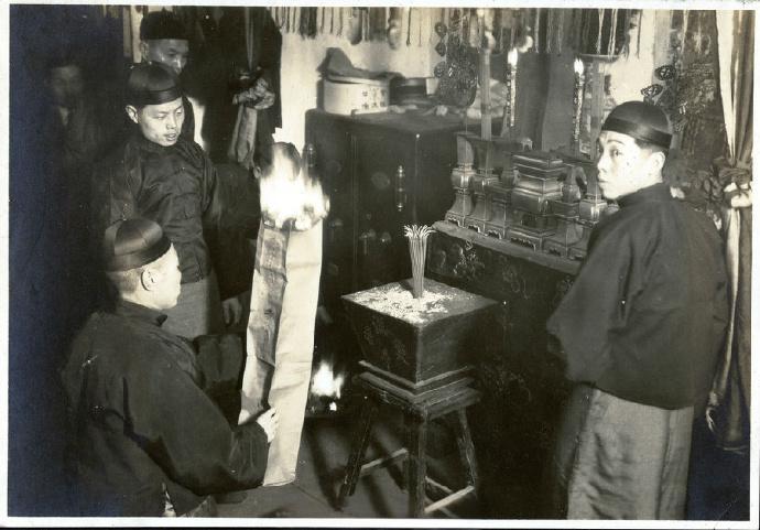 这三张清末民初的老照片,记录了辽宁营口地区满族家庭庆祝农历新年的传统家祭。照片中人物多为男性,身着清末民初常见的长袍马褂,头戴瓜皮小帽,室内陈设简朴却庄重。 第一张:六七名男子参与仪式,神案丰富,四人跪地叩头行大礼,一人持灯笼,其他人站立或持物。 第二张:室内家堂前,四名男子围立。一人手持长卷纸(可能是祭文或神轴)在火盆上焚烧纸钱,火焰升腾,烟雾缭绕;另一人注视香炉,神案上供奉多层神龛、烛台、供品,氛围肃穆神秘。 第三张:五六人围坐或站立,桌上置茶壶、碗盏,一人持酒壶斟酒,墙上挂神像或祖先画像。 清末民初,营口作为辽东重要港口城市,满族人口众多,许多家庭保留传统家祭习俗。新年祭祖是满族最重要的岁时活动之一,从除夕持续至正月十五,常在除夕午夜请神、烧纸钱、合族团聚,祈求家丁兴旺、祛灾纳福。