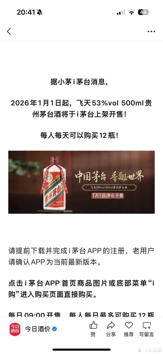 据小茅i茅台消息,2026年1月1日起,飞天53%vol 500ml贵州茅台酒将于i茅台上架开售!❗️每人每天可以购买12瓶!