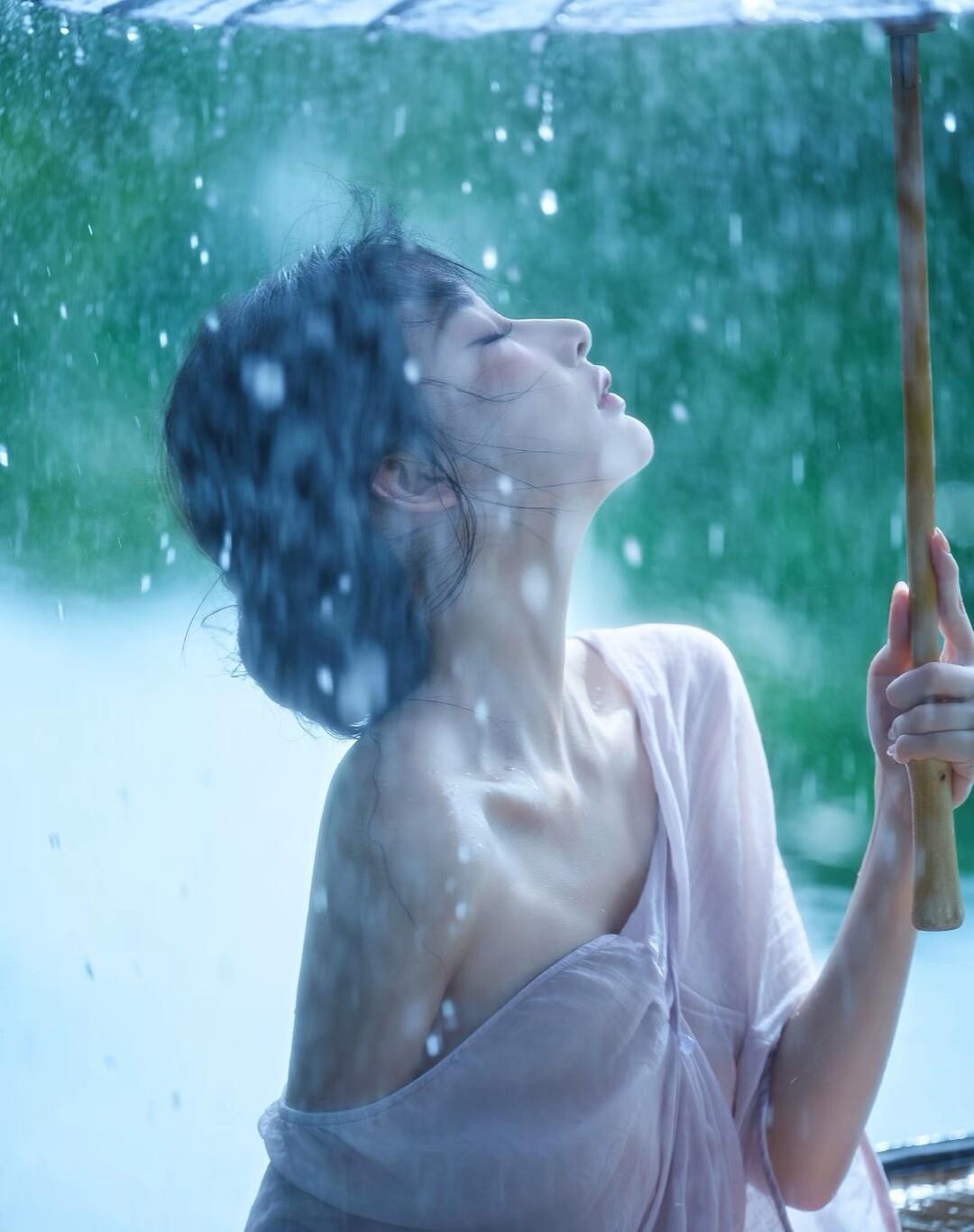 雨中少女,撑伞静坐,古风韵味,唯美意境。