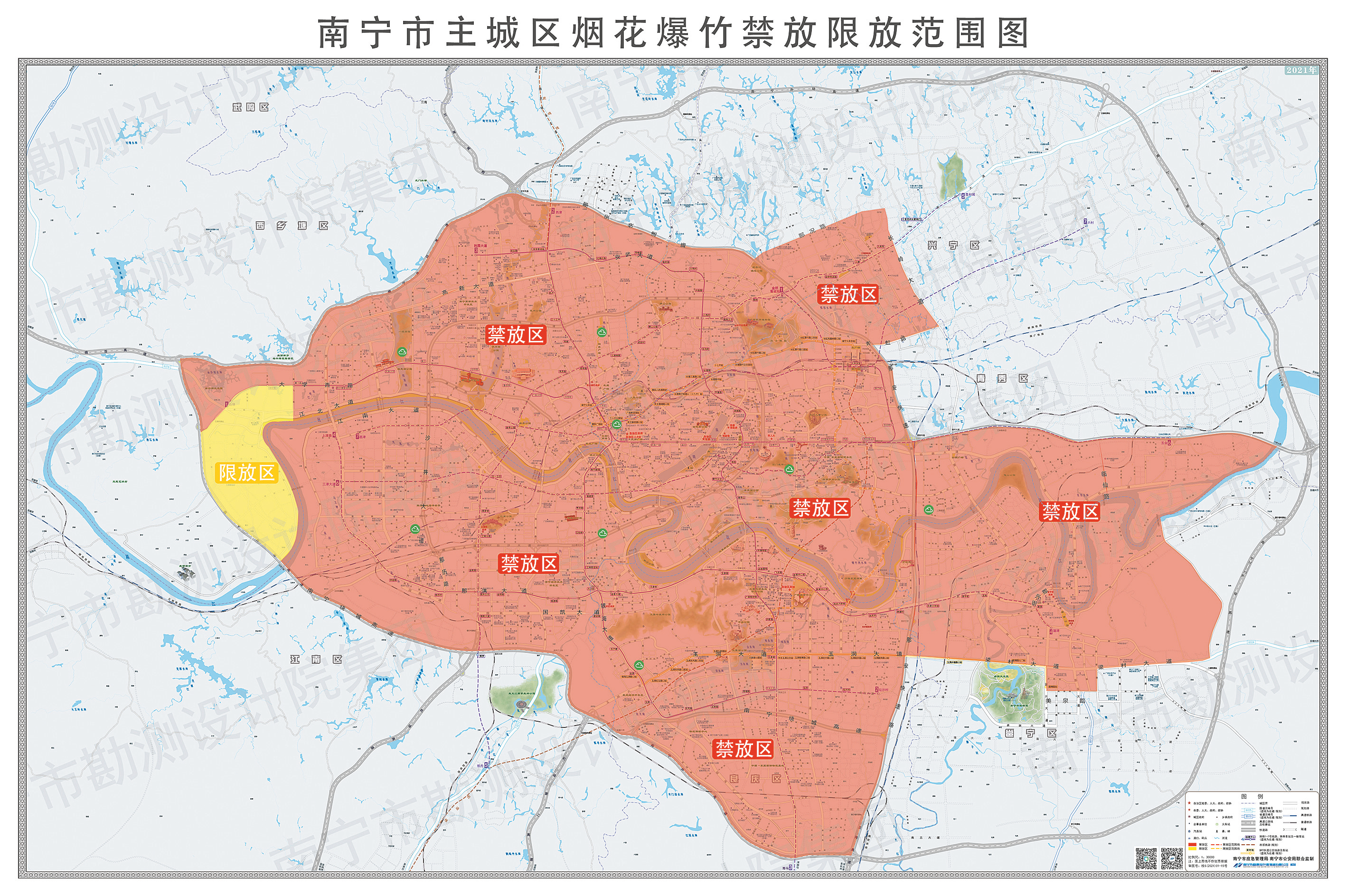 南宁市主城区烟花爆竹禁放限放区域示意图。(南宁市生态环境局供图)