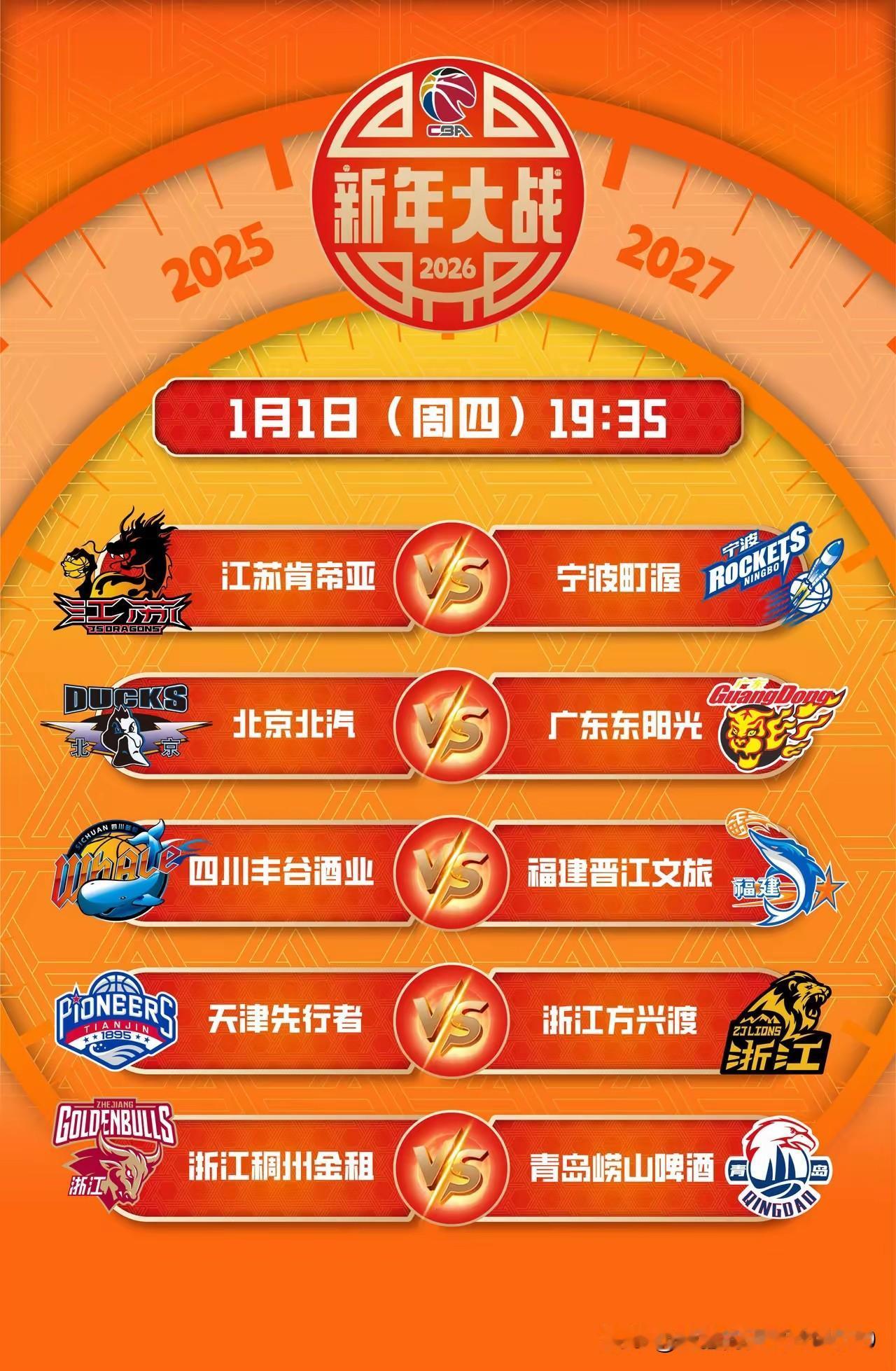 [玫瑰][玫瑰][玫瑰]2026年新岁启封,元旦之夜,CBA联赛将上演五场比赛,