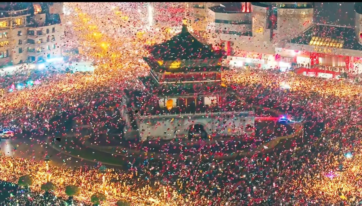 图一为昨晚跨年夜时西安钟楼的场景, 图二为2024年12月31日的跨年夜场景