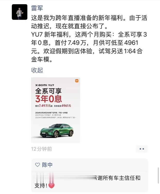 雷军公布小米YU7新年购车福利:首付7.49万起,月供低至4961元