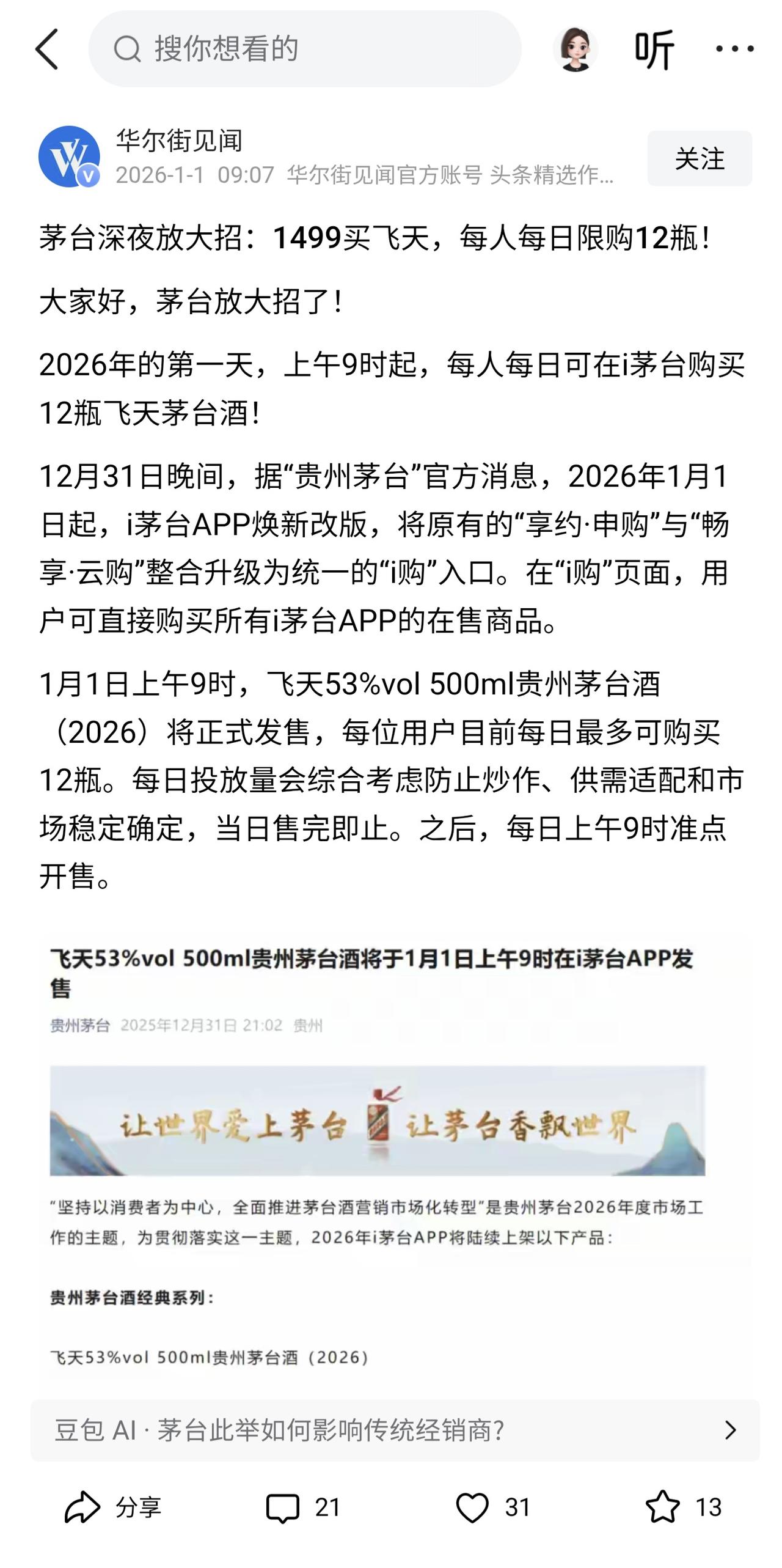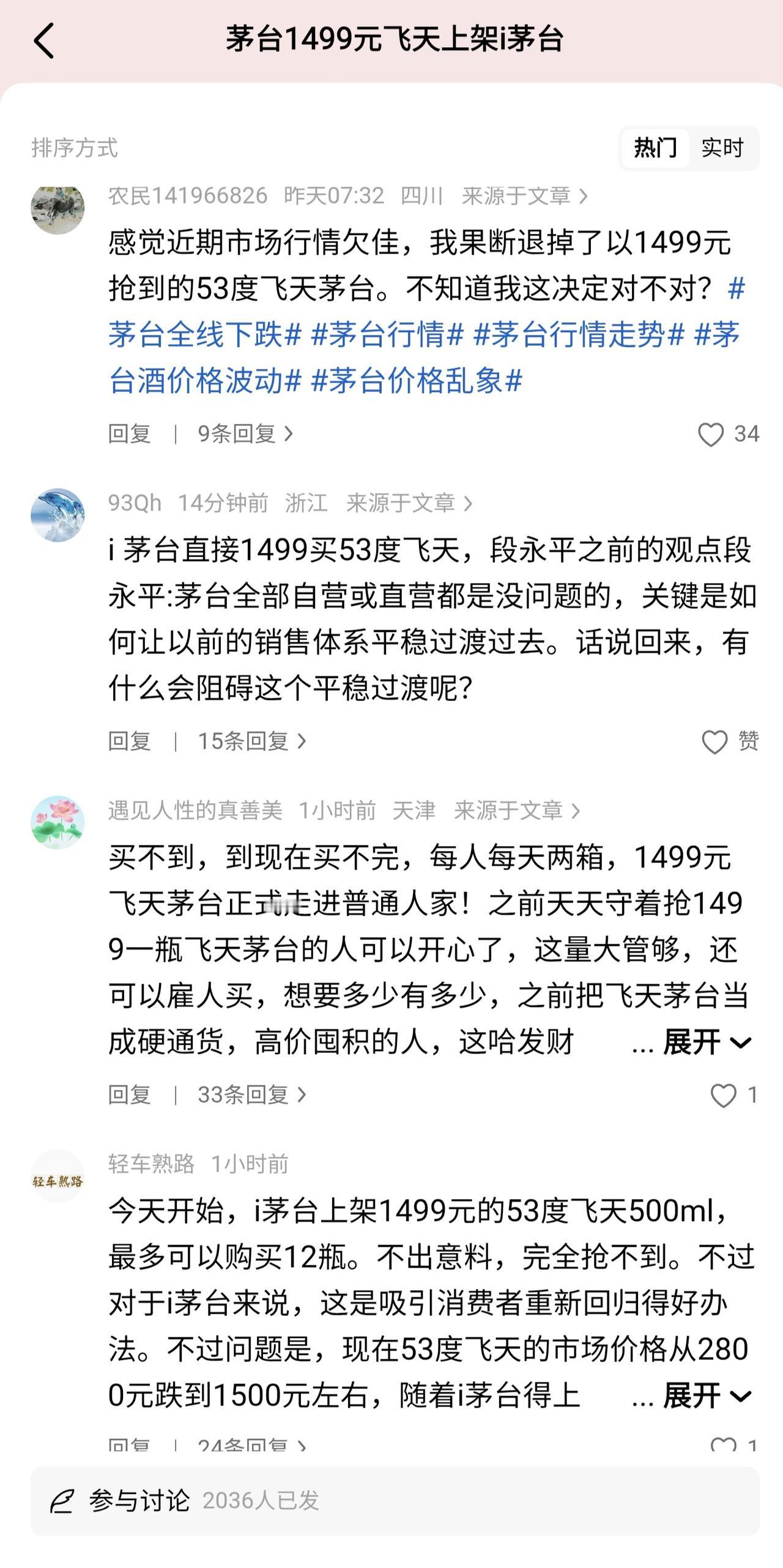 茅台为什么选择这个时机把飞天上架i茅台放开购买? [送自己一朵花]以前茅台价格为啥坚挺?前些年茅台酒价格炒作节节升高与经济形势有很大关系,大家想想,都是什么规模的企业,还敢成箱成箱地开茅台搞招待?以前那些喝茅台的场面,多少都跟项目、审批、生意绑在一块 另外一个原因就是中间商的炒作,茅台酒真全是喝掉的吗?拉倒吧,其实很大一部分被经销商和炒家囤在库里,茅台酒成了“金融产品”。一瓶酒从出厂到消费者手里,中间可能被转手加价好几次。厂家指导价1499,市场价能炒到3000,这巨大的利润差,肥了谁?中间商肯定赚了钱,但茅台有放任的成分吗? [鼓掌]知道他原来价格坚挺的原因,现在价格收缩的原因自然就清楚了,伴随着疫情之后的经济下行和国外贸易制裁,企业扩大规模和项目的意愿降低,市场需求迅速下降,于是酒就堆在库里了,价格自然就下来了,这也是市场规律的作用 [苦瓜]为什么茅台酒厂这个时候出手了?茅台厂那帮人,精得跟猴儿似的。他们早知道价格炒得太虚,经销商库里囤的货都快成“隐形产能”了。这玩意儿就像个雷,以前行情好,大家假装看不见。现在呢?经济风一吹,正好! 于是,“i茅台”就从一个不痛不痒的预约平台,变成了直接卖1499飞天的利器。这一手,高明,这是在主动挤泡沫,把虚高的价格打下来,重新夺回定价权还顺势整顿渠道,为下一个周期继续做龙头老大做好准备。