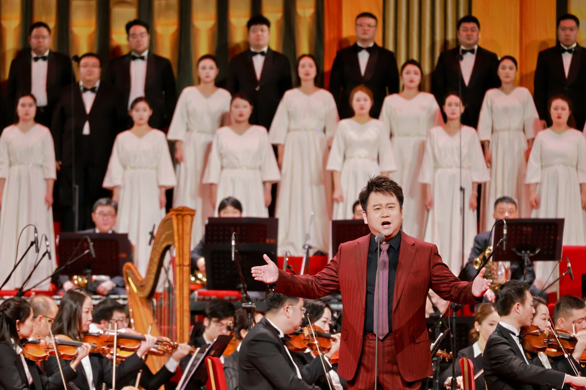 西方经典曲目也在音乐会上轮番登场。小约翰·施特劳斯的《蓝色多瑙河圆舞曲》如流水般轻盈,约瑟夫·施特劳斯的《铁匠波尔卡》上演铁砧打击乐,几位身穿铁匠服饰的演奏家带来诙谐欢快的“铁匠作坊”场景,让观众忍俊不禁。《万马奔腾》《渔舟唱晚》等传统曲目,则在民族器乐与交响乐团的交织中勾勒出古典意境,开启中国作品与世界旋律的对话。男高音歌唱家薛皓垠更是以《北京颂歌》和《我的太阳》两首中西经典,为观众献上祝福。